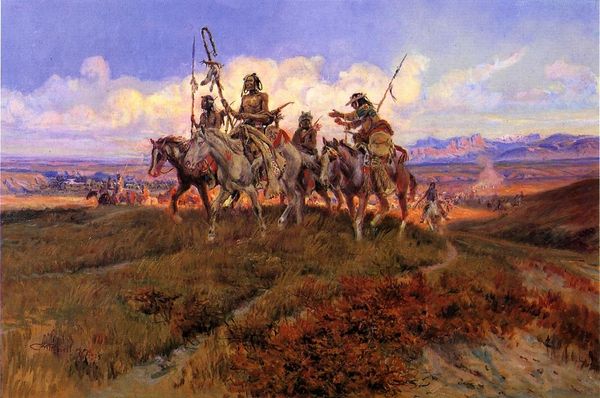 Charles M. Russell made this painting, Single Handed, with oil on canvas, and wow, what a scene. The way Russell builds up the image with these loose, almost flickering brushstrokes gives it such a sense of movement, like the whole thing is vibrating with energy. I’m drawn to the way he renders the figures, particularly the rider and his horse at the center. Look at the way Russell uses these vivid reds and blues, really pushing the saturation to create a focal point. But it's not just about color, it's about texture too. You can almost feel the grit and dust of the landscape. The details are amazing, like the way the light catches on the metal of the guns. And that tension! You can feel the conflict. Russell’s work reminds me a bit of Frederic Remington, another artist obsessed with the West, though Russell, having lived among these communities, brings an insider's perspective to the subject. It all feels so alive, you know? Like a moment caught in time, and that’s what makes it so compelling.