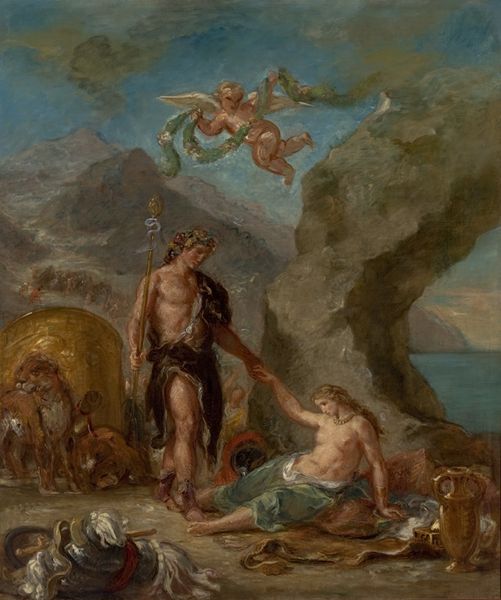 Editor: Delacroix's "Bacchus and Ariadne," a sketch, feels raw and immediate. I'm struck by the visible brushstrokes. How does the materiality of the paint contribute to its meaning? Curator: Consider how Delacroix’s quick brushwork and layered pigments served the purposes of mass production through preparatory sketches. It’s about artistic labor – the physical act of applying paint to canvas, replicated across his atelier. Editor: So, the sketch itself becomes a commodity, part of a system? Curator: Precisely. We're not just seeing divine figures but also evidence of the artist’s, and assistants', hand and how that factors into the art market. Editor: That reframes the work. I appreciate considering the means of production. Curator: And that shifts our appreciation to understand the cultural impact that artistry has upon the world.