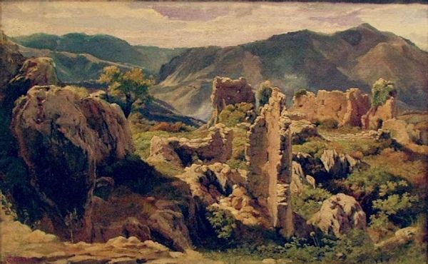 Editor: So, this is "A Fisherman Hanging Fishing Nets" by Fyodor Bronnikov, painted in 1875, with oil on canvas. There’s such a tranquility about this work. The hazy blues and greens create a dreamlike setting. What do you see in this piece that I might be missing? Curator: I see a longing, perhaps. Bronnikov captures a fleeting moment, yes, but it’s more than just pretty scenery, isn't it? The crumbling wall speaks to time's relentless march, juxtaposed against the fisherman diligently preparing his nets, an act of hope for the future, like the cycle of seasons or the waves against the shore. The painting has a heartbeat that reminds us that decay and hope live side-by-side, not battling for space, but intertwined. Editor: The decay aspect didn't immediately jump out. I was so caught up in the landscape itself! You’re right, though. It's not just pretty; there's a melancholic beauty in the old stone wall that carries stories of time and effort, which brings context to the fisherman's actions. It's a simple scene but there is profound poetry to it. Curator: Indeed. The figures, seemingly small against the grand vista, become all the more powerful *because* of that scale. It asks us: who shapes our life more, the mountains that look down upon us, or our daily toil? And the painting, as such, provides no definite answer. Editor: It’s fascinating how one viewing shifts simply by considering a different perspective. Thanks for making me look past my first impressions. Curator: My pleasure. It’s through these shared observations that art truly lives, constantly reshaping itself with each new set of eyes.