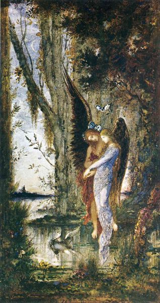 Curator: Standing before us is Gustave Moreau's "L'Inspiration," a watercolor and oil painting he worked on from 1883 to 1898. Editor: Oh, it feels like stepping into a dream. The colors are so ethereal, like faded memories painted on mist. Is that... an angel whispering secrets in her ear? Curator: Precisely. Moreau often explored mythological and allegorical themes. Here, we see a woman, perhaps a muse, seemingly receiving inspiration from a winged figure. Notice how the light gently touches them both? Editor: It's the contrast, though, that grabs me. She's got this serene almost classical grace, while the background is all swirling, dark Romanticism. The swan, the dark forest – very Wagnerian! Was Moreau deliberately setting up this tension? Curator: I believe so. Moreau was deeply interested in the interplay of opposites, light and shadow, intellect and intuition. The swans are the vehicle, literally at the lady's feet, to access the realm of ideas. One might look to Lohengrin as well. The background provides this mystical atmosphere. Editor: It's striking how much this reflects the anxieties around artistic creation in the late 19th century. The artist grappling with forces beyond them. Curator: Yes! There’s an entire social discourse, if you will, of academic and institutional doubt about artistic subjectivity, a rising cult of celebrity of artist figures and their role in France that Moreau, as a professor at the École des Beaux-Arts, would have definitely internalized. He was definitely working in a milieu wrestling with the nature of inspiration itself. Editor: You almost feel like you're intruding on a very private moment. All these little symbols whispering about some mysterious story of inspiration. It gives me the shivers! Curator: It's as if he is making a case that art comes from another space, it does not arise on its own... Something has to come in. A Muse is as good an actor to get into this stage. Editor: It's quite something, this conversation. The more I look, the more I appreciate his blend of ethereal beauty and deeper symbolic weight. Thanks for bringing this one into focus. Curator: Indeed. The more one dwells with Moreau, the more the inner worlds unveil themselves and invite the dreamer along.
