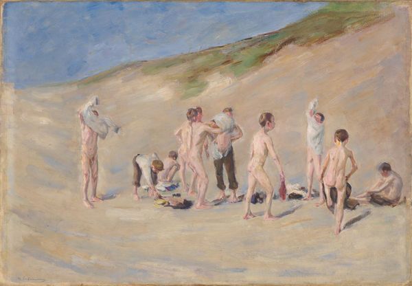 Curator: Before us, we have Maximilien Luce's "La Plage De Mers-Les-Bains," an oil painting dating to 1934. It certainly captures a moment of leisure. Editor: There's a muted, almost dreamlike quality to the colors. It's summery but without the harshness you might expect. What strikes me is the light. How would you describe the composition? Curator: Formally, Luce's application of Impressionist techniques—short brushstrokes, the broken color—defines the beach scene. Note the composition. Luce uses a high horizon line, common among his landscapes that divides land and the distant background. It makes use of those flattened perspective characteristic of much post-impressionist painting. What strikes me more, however, is how Luce often painted workers and laborers; here he shows their leisure, suggesting evolving societal conditions and increased access to time-off and the sea. Editor: Yes, the light! It unifies the whole scene. The softness you pointed out is likely down to those colors and those shorter strokes he employed. The darker blue costumes create a subtle tension with the surrounding pastel shades. This palette choice creates a tranquil, nostalgic mood. It brings out a striking effect on the representation of sunlight and shadow. Curator: Absolutely, and you cannot dismiss that shift from a more laborious subject. Here Luce captures a social scene in leisure. It highlights access and changing dynamics. We also have to acknowledge the shift in production as a function of this new access to leisure – with companies providing seaside goods and entertainment that capitalize on that market. Editor: Perhaps the charm comes from this balanced color contrast? The artist's technical understanding comes together. We're left with a quiet, peaceful impression. I almost feel a salty breeze looking at it! Curator: For me, it’s the suggestion of access – what used to be inaccessible to all now enjoyed as a common moment, though with hints of labor present through the equipment they use for playing on the sand. That is quite a compelling concept. Editor: And for me, it's a masterclass in capturing a mood. It goes to show you how crucial formal techniques can influence art viewing.