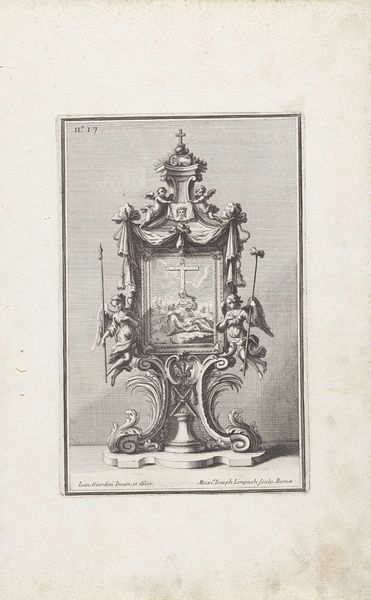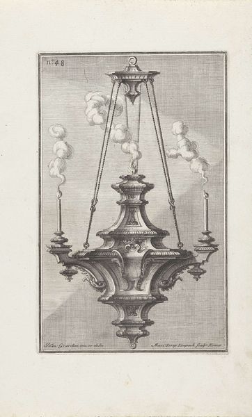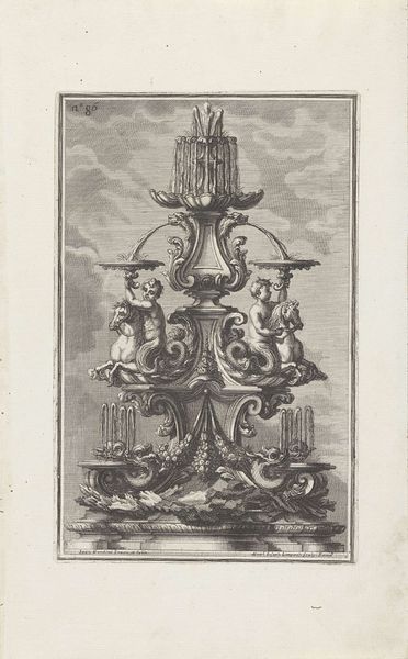 This drawing of a candelabra was made by Maximilian Joseph Limpach, and it’s an etching, a printmaking process where lines are incised into a metal plate, inked, and then printed. The material qualities of the print are stark: the contrast between light and shadow, the precision of the engraved line, and the implied textures of the nymphs and other decorations, all rendered through the skilled application of technique. Etching like this was a commercial process, often involving many hands. The designer creates the image, but then specialized artisans transfer the design to the plate, etch it, and print it. Notice how the candelabra design is an elaborate affair, featuring sea nymphs and the personification of night, demonstrating a high level of craft. While the print itself could be widely distributed, the object it depicts would have been a luxury item, requiring the skills of a silversmith or metalworker, indicating the different levels of labor involved, and intended for an elite consumer.