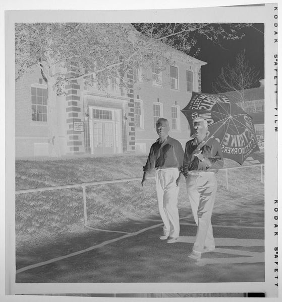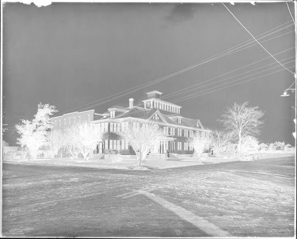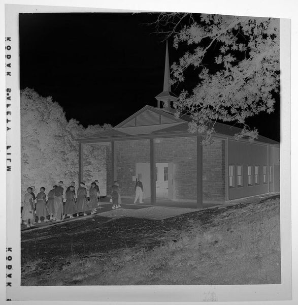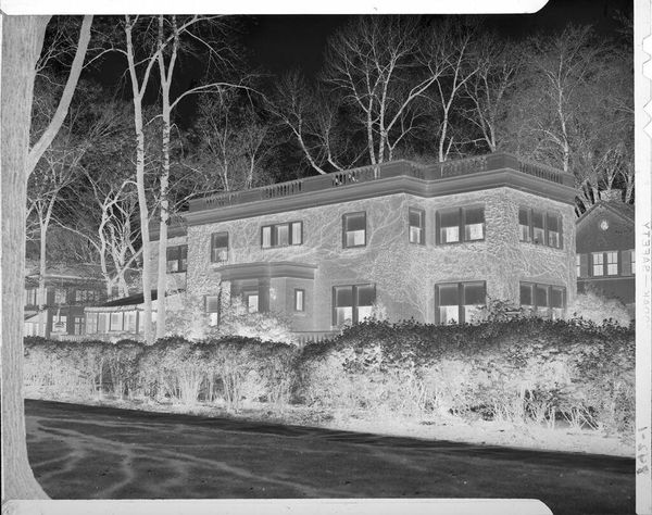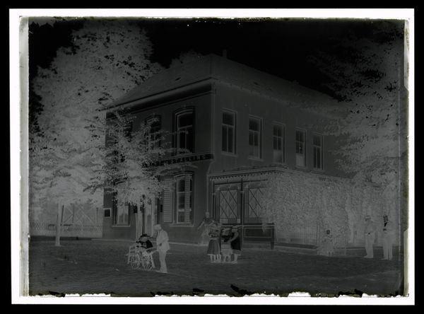 Curator: Here we have an untitled photograph, depicting children in front of a house in the snow, by Lucian and Mary Brown, currently held in the Harvard Art Museums. Editor: It's haunting. The stark contrast makes the snow-laden branches look like skeletal fingers reaching out. Curator: The image's material construction as a negative, reverses our expectations. It invites questions about the photographic process itself. Editor: Exactly. The materiality—the film, the chemicals used—becomes paramount. We're reminded of the labor involved in capturing even this seemingly simple moment. How the means of production shaped what we see. Curator: This artistic choice alters our perception of American domesticity. Its display in museum spaces transforms the domestic into a public spectacle. Editor: Right, and it disrupts any notion of easy consumption. The reversed tones make us work to decipher it, engaging actively with the image. Curator: The starkness, I believe, highlights how social class and access influence the creation and distribution of images like this. Editor: And it forces us to consider the labor that goes unseen, the labor involved to produce such a strange reversal of reality. Curator: Ultimately, it prompts questions about who gets to depict whom, and under what conditions. Editor: Indeed, a chilling yet thought-provoking piece, both in its making and in the questions it provokes.
