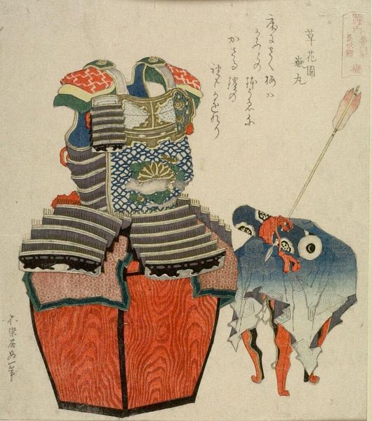 Editor: This is "Puppets Representing Goro and a Fox" by Teisai Hokuba. I am curious about this image, and I notice the figures are holding hammers. What historical context can you give us about this? Curator: Hokuba situates us in the vibrant world of Japanese puppet theatre, Bunraku. Note how the figures, Goro and the fox spirit, brandish their mallets, symbols of power, reflecting the plays' morality tales. Consider how such depictions played into socio-political dialogues. Editor: So, the artist is making a statement about Japanese society and its values? Curator: Precisely. Hokuba uses popular culture to engage in broader cultural commentary. Think about the role of theatre, and how it challenges norms. This art piece offers a lens to explore themes of morality. Editor: This helps me appreciate the layers of meaning. Thanks! Curator: It’s fascinating how art can embody history and activism, isn't it?