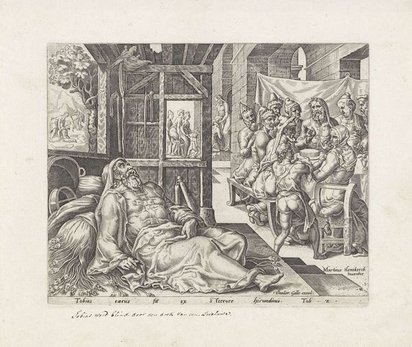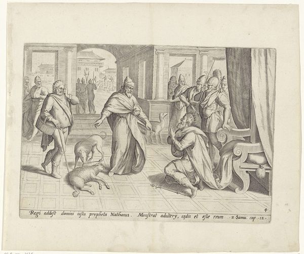 Editor: So, this engraving by Philips Galle, from sometime between 1557 and 1591, is called "Boaz koopt het land van Ruth en Naomi." It's currently at the Rijksmuseum. The whole scene feels very deliberate, almost staged. Everyone is in their place. How do you interpret this work? Curator: The formality you perceive is very telling. Consider the symbolism inherent in a public transaction during this era. Notice how the act of Boaz buying the land is not just a business deal, but a re-establishment of order, a restoration of social and familial continuity. Editor: So the setting isn't just decorative? Curator: Precisely. The architectural backdrop, the arrangement of figures, and even the light and shadow, are all carefully orchestrated to convey a sense of gravitas and the weight of tradition. Look at the man removing his shoe. That symbolic act cements the deal. Editor: The shoe. I wouldn't have thought much about that. What does it signify? Curator: It's a powerful emblem of transfer, relinquishing a right or claim. This act carries within it cultural memory and continuity through visual symbols, steeped in historical context. The man removing his shoe indicates not just a legal agreement, but an acceptance of moral responsibility to preserve the lineage and heritage of Ruth and Naomi. Can you see how it resonates? Editor: Definitely. I initially just saw a crowded scene, but now it feels much more meaningful, laden with symbolism and cultural significance. Curator: Indeed. What appeared to be a historical snapshot is, in fact, a meticulously constructed tapestry of cultural values, historical consciousness, and the enduring power of symbolic action.