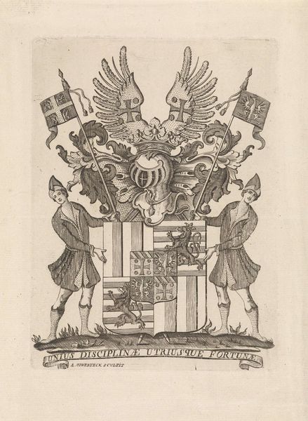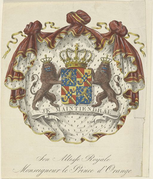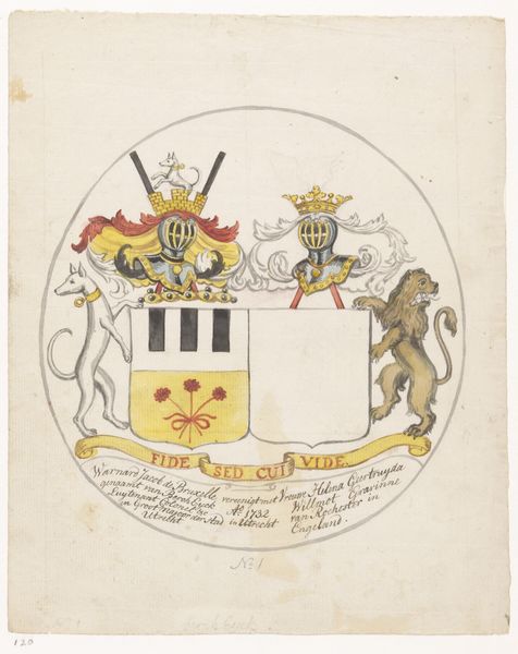 Curator: Here we have "Crest - Name of Beckett," a watercolor and coloured pencil drawing on paper, made around 1790. The work is currently held here at the Minneapolis Institute of Art. Editor: My first thought is how wonderfully decorative and symbolically rich this crest appears. You instantly get a sense of lineage and the importance of heritage through visual representation. It feels very stately. Curator: Indeed. Crests like these, beyond simply representing a family's identity, are like compressed narratives. In a sense, it becomes a public proclamation about who they are, what values they uphold, and even, sometimes, a shorthand for their history. Note the bundles of wheat in the main shield, for example. Editor: Right, I see the wheat! It suggests prosperity, abundance, maybe even ties to agriculture and the land. The imagery creates these immediate links to cultural values that remain relevant and consistent over time. Curator: Precisely! And then there are the two avian figures that flank the crest—likely mythical beasts, serving as guardians. They add to the aura of importance, suggesting not just wealth but also perhaps the need to defend their legacy, to have strength. Editor: It's fascinating how visual symbols crystallize meaning in such efficient ways. Each element seems to be a calculated part of a message meant to communicate status. How were these designs decided upon, back in the day? Curator: Great question! Guilds of heraldic artists existed. Designing these crests would involve intricate negotiations with families—to properly display status but also reflect the family’s history, achievements and affiliations, and any alliances they wished to publicly show through those symbols. Editor: So the image itself becomes part of history as it records political dynamics? I am left wondering how many people actually knew what these images meant to communicate at a time where images were nowhere near as widespread as they are today. Curator: An intriguing consideration! These crests likely circulated among a more literate class. In essence, it's less about mass communication and more about signaling among a certain segment of society. Now I’m curious to investigate which parts of these emblems remained recognizable through wider cultural memory… Editor: Yes, an excellent angle. And what better symbol than one meant to remind an entire clan of their combined identity?