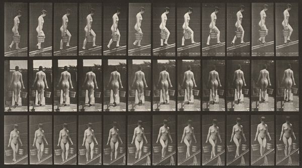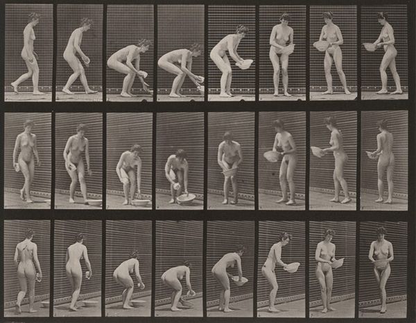 Eadweard Muybridge created "Plate Number 507. Carpentering" using a photographic process. The print presents a grid-like arrangement of sequential images, capturing the movement of a man engaged in carpentry. The composition dissects motion into discrete units. Each frame, with its stark lighting and neutral background, focuses on the body's spatial dynamics. Muybridge challenges traditional notions of static representation. Instead, he employs seriality to deconstruct the illusion of continuous time. The rigid structure of the grid also invites a semiotic interpretation. Each photograph can be seen as a sign. When viewed collectively, these signs create a visual language that explores the mechanics of human action. This breakdown of movement into constituent parts parallels developments in scientific analysis and the burgeoning field of biomechanics during the late 19th century. The artwork’s form is not simply aesthetic but embodies a broader cultural impulse to dissect and understand the material world through systematic observation.