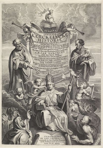 Curator: The symmetry and precise lines immediately strike me in this baroque engraving. There’s an almost mathematical quality to the composition. Editor: Indeed. The Rijksmuseum holds this remarkable title page, “Titelpagina voor: Oliver Florentius Waterloop, Monita spiritualia et moralia," created in 1657 by Cornelis van Caukercken. As a print and drawing, its social context as a book illustration is really important. Curator: I am intrigued by the cascading levels – from the Virgin and Child at the apex, radiating light, to the cascading fountain and then the portrait at the base, firmly rooted in earth. There’s a strong directional force at play, pulling the eye. Editor: And those tools hanging in the tree above the Virgin Mary—ladders, ropes. What narrative are they suggesting? I’d hazard a guess these tools evoke salvation. It is a piece steeped in religious iconography designed for didactic purposes. Curator: Semiotically, those flanking figures add to that reading, with their formalized gestures offering us insight into their allegorical meaning within the artist's design. They act like textual anchors, offering guidance to interpret the other details within. Editor: Exactly! This wasn't merely decoration; the book served an important function within 17th-century religious culture, and the image worked to immediately signal the content's spiritual focus to a literate, and devout, public. Curator: What’s fascinating to me is how Van Caukercken used line and form here to communicate this piety so efficiently. It is almost schematic but is simultaneously alive with visual texture. Editor: It illustrates how much power visual language held during a period rife with religious and political turmoil. The printing press allowed images like this one to influence how the world was perceived in ways that were radically different than those that came before it. Curator: Reflecting on the details here, from line to allegorical structure, clarifies that the graphic arts of the Baroque period aimed for far more than pure aesthetic pleasure. They engaged in the articulation of knowledge itself. Editor: Yes, thinking through its place within society underscores the very real role that prints such as this one had in promoting morality. It makes one wonder how artists today conceptualize public virtue and communicate similar ideas.