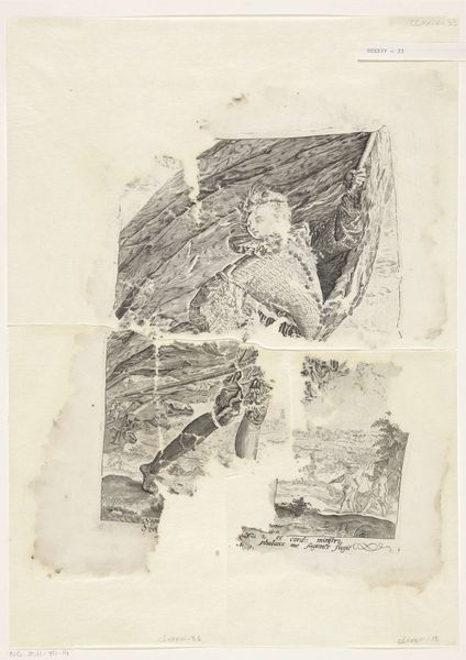 This work, Vaandeldrager, of unknown date, is rendered in pencil on paper. The composition presents fragmented images, each meticulously detailed yet disjointed, which evokes a sense of deconstruction and perhaps even the ruin of memory. The upper section features the titular standard-bearer, emerging from what appears to be a flag or banner, while the lower sections offer glimpses of landscape and figures, obscured by tears and gaps in the paper. These absences are as meaningful as what is present, inviting reflection on what is lost and what remains. The artist here employs a strategy reminiscent of collage but executed entirely through drawing. The use of pencil allows for a range of tones and textures, emphasizing the materiality of the paper and the physical act of creation. This piece unsettles conventional notions of representation, reminding us that art is not merely a reflection of reality but also a construction, subject to fragmentation and reinterpretation.