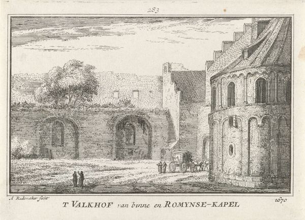 Editor: Here we have Abraham Rademaker's "Gezicht op Kasteel Culemborg," a print from somewhere between 1727 and 1733, housed here at the Rijksmuseum. It's got this old-world, almost fairytale feel, but with a hint of everyday life in the boats. What strikes you about it? Curator: Oh, it whisks me away! The cool precision of the line engraving gives it that structured, Dutch Golden Age vibe, but there's also a freedom in how Rademaker captures the light on the water, wouldn't you say? It feels almost…dreamy. Do you notice how the castle, while clearly the focal point, is softened by the surrounding trees? Editor: Yes, it’s not as imposing as I would expect a castle to be! More like part of the landscape. Curator: Exactly! It speaks to the Dutch sensibility of integrating with nature, even when it comes to grand architecture. I love how the boats in the foreground aren't just window dressing, either. They are active, with people, adding a layer of narrative. What stories do you think they hold? Editor: Maybe just people going about their day, or traders moving goods. But it is nice that the castle isn't the whole story. Curator: Indeed! Rademaker masterfully weaves together cityscape and landscape, inviting us into the scene. It makes me wonder, though, was this purely documentary, or was he trying to say something about the relationship between power, nature, and everyday life? Food for thought, eh? Editor: Definitely! It’s amazing how much is packed into such a small image. I’ll never look at a simple landscape the same way again. Curator: Precisely. Now you’re starting to think like an artist!