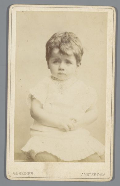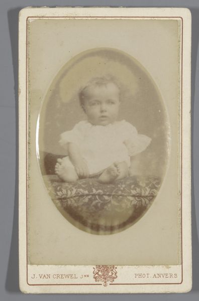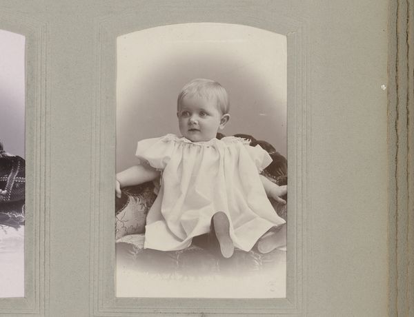 Curator: Here we have a gelatin silver print from between 1898 and 1900. It's entitled "Portret van Willem Jonker" and the photography studio credited is Koene & Büttinghausen. Editor: Oh, goodness, that baby! What a serious expression for such a little one. There’s something hauntingly innocent about the gaze, and it just sucks you right in, doesn’t it? The monochrome tones also contribute to a timeless feeling; it could have been taken yesterday or a hundred years ago. Curator: Exactly. That tension between intimacy and detachment speaks volumes. The portrait format places Willem centrally, almost forcing the viewer into an immediate relationship with him. And you feel that historical context of childhood and representation so strongly in his gaze, his clothes, everything. The studio photography format was used, and still is to this day, to create a particular sense of self, but how much control did the child have in all this? Editor: Makes you wonder what was going through that tiny little mind! I also can't help but notice the texture; it's velvety smooth in the backdrop and on that luxurious fur he's sitting on, but grainy where it touches his face and those sweet clothes. Gives it an almost dreamlike, otherworldly quality, wouldn't you say? Curator: The softness definitely lends itself to idealised visions of children in the late 19th century. Thinking about gender, for instance, the infant’s attire blurs those boundaries – it makes you think about social constructs. What expectations does that build? Editor: Definitely. The more you unpack such an innocent image, the more complex it becomes. You look beyond just the child, but society itself! Curator: These early portraits often did attempt to codify emerging societal roles, in particular family dynamics. The almost unsettling seriousness in the child is such an invitation to probe those roles further. Editor: It’s fascinating how an image can encapsulate so much and challenge us. Looking at "Portret van Willem Jonker," it is an excellent example of how technical art meets with how we see and analyse not just what the baby is or how he is portrayed, but what he represents of us and our shared values.