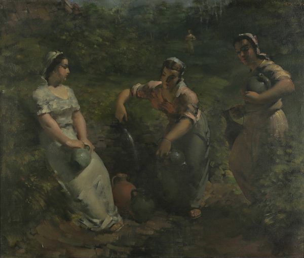 Jules Breton created this painting, ‘The Close of Day,’ with oil on canvas. The scene is dominated by muted earth tones, punctuated by soft light that evokes a sense of quiet contemplation. The structure of the composition is defined by the vertical lines of the women and their rakes, offset by the horizontal stretch of the field. Consider how the artist has rendered the texture of the clothing, the rough-hewn tools, and the organic quality of the landscape. These elements, through their materiality, introduce a philosophical query on the relationship between humans and their environment. The semiotic system at play here invites us to interpret the cultural codes associated with rural life, labor, and femininity. Note the destabilization of traditional artistic values as Breton engages with the realities of peasant life. The artwork challenges idealized notions of pastoral beauty, grounding us in the physical and emotional terrain of its subjects. This piece exists not just as an aesthetic object, but as an ongoing dialogue about representation, labor, and the human condition.