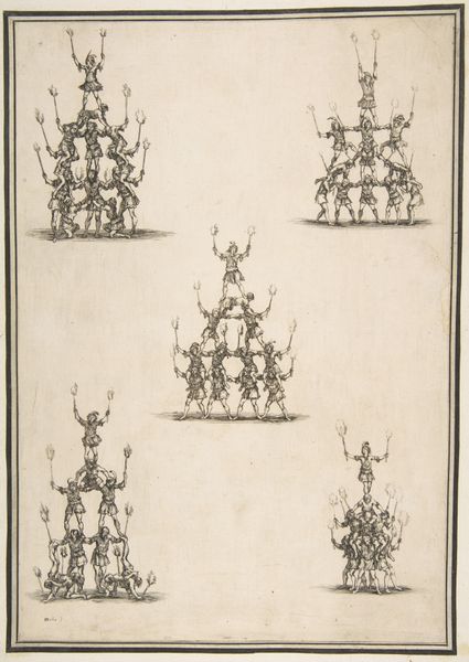 This etching, ‘Four riders in a row at bottom, five riders forming a V above and another rider in the center, from 'La gara delle Stagioni’, was made by Stefano della Bella. In it, one is immediately struck by the almost mathematical composition, where the grouping of riders suggests an exercise in spatial arrangement. The linear quality of the etching technique, combined with the repetitive motif of horse and rider, creates a sense of rhythm and order, yet it also hints at underlying tensions between the individual and the collective. Consider how the arrangement of figures might symbolize the social hierarchies of Della Bella’s time, or perhaps how it reflects a broader philosophical interest in systems and structures of power. This work destabilizes any singular interpretation, inviting us instead to consider its multiple layers of meaning. Ultimately, the formal clarity of the composition underscores its conceptual complexity, a hallmark of Della Bella’s engagement with the intellectual currents of his era.