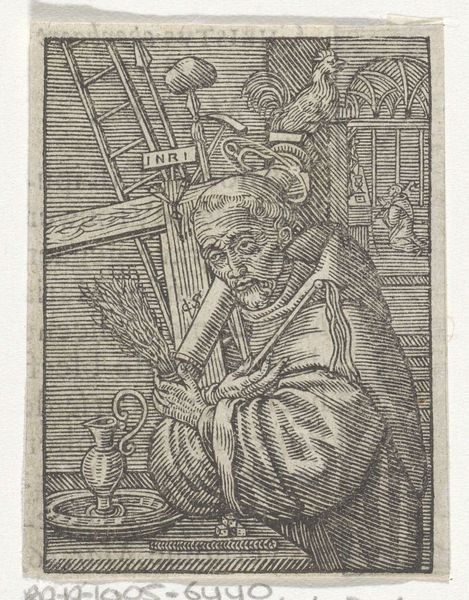 Curator: Let’s take a look at Lucas van Leyden's engraving of Saint Luke from 1518. The fine detail achieved through engraving is really quite remarkable. Editor: Remarkable and somehow melancholic, isn't it? He looks so contemplative, hunched over his work, as if the weight of scripture—or maybe just the daily grind—is bearing down on him. Curator: Well, Saint Luke is traditionally depicted as a painter as well as an evangelist. We see him here in the midst of creation, possibly depicting the Virgin Mary, guided by his symbol, the ox. This engraving participates in a long history of artistic self-fashioning by painters. Editor: The ox just hanging out in the background adds this absurd, surreal touch. He is kind of cramped up there with barely enough space to contain his horns. Is he an active muse or just watching? Curator: It’s interesting you call him cramped. Lucas van Leyden’s print participates in a cultural milieu deeply immersed in the circulation of imagery and associated concepts about art, so that placement must have been quite intentional. Prints had a uniquely democratizing role in the art world during the Northern Renaissance, circulating imagery broadly and solidifying ideas about art and the artist. Editor: It makes me think about the labor of creating such tiny, detailed lines. It almost looks obsessive, which sort of humanizes the Saint. One mark at a time, building a world with the tip of a tiny knife. What do you imagine someone who poured his life into minute work, felt? Curator: I think van Leyden consciously participated in this emergent construction of the artist as a creative genius through the depiction of St Luke. It's less about psychological reality as it is about solidifying an image of the artist's status within society. Editor: Fair point. Though, I will forever picture the ox whispering jokes in Saint Luke's ear. It is kind of comforting to imagine artistic greatness has little secrets. Curator: A testament to art history’s charm: you can leave with new ways of perceiving something both grand and personal. Editor: Always new perspectives and a whole new surreal story to be told about the artist.