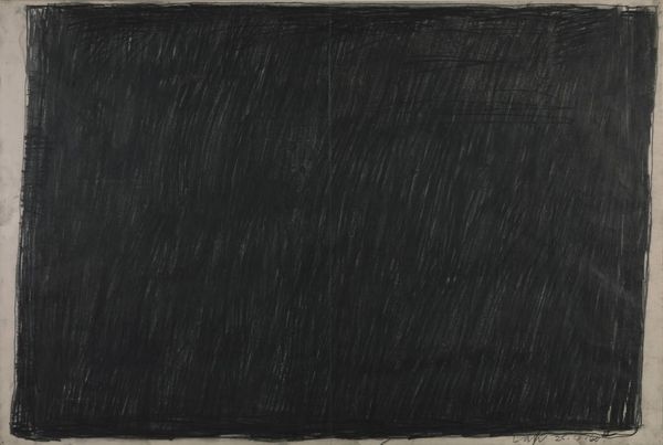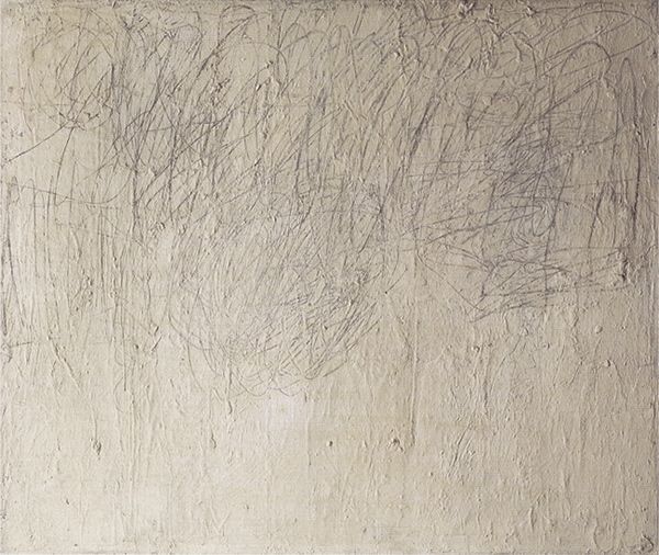 This striking, untitled painting by Cy Twombly is part of a series that he made using wax crayon on a grey ground. The surface of the artwork seems simple at first glance, but the apparent ease of execution belies the deliberate process involved in creating such rhythmic energy, line after line. It's a repetitive gesture, almost meditative, calling to mind a child's classroom blackboard exercises. Yet, the layering of marks reveals a sophisticated understanding of texture, weight, and form. The materiality of wax crayon lends a tactile quality to the surface, the strokes creating a visual echo of the artist's hand movements. In his work, Twombly blurred boundaries between writing, drawing, and painting. He elevates the everyday act of mark-making into a work of art, reminding us that the simplest materials and processes can yield profound results. By bringing the aesthetics of craft into fine art, Twombly challenges traditional distinctions and expands our understanding of what art can be.