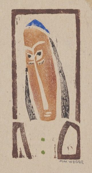 Editor: This is “Schild,” a woodcut print by Reijer Stolk, created before 1942. The image, composed mainly of lines and geometric forms, feels a little unsettling. It's hard to put my finger on why. What do you see in this piece? Curator: The abstract nature, combined with the title "Schild," or "Shield," invites a consideration of protection, perhaps on a symbolic or even psychological level. Given that it was created before 1942, do you think it is possible that it relates to anxieties surrounding World War II? Editor: That's interesting! The idea of anxiety definitely resonates. I hadn’t considered it in relation to a specific historical moment, only on the emotional level. I guess I saw "abstract" and didn't immediately think about historical context. Curator: Abstraction isn’t divorced from social realities. Look at the stark contrast of colors, the seemingly totemic central figure, the repetition of line... Could this be read as a commentary on the rise of totalitarian regimes, which threatened individual identity? Editor: It’s possible! The shield shape could be about defense, but the exposed interior is interesting. If it’s a defense against totalitarianism, maybe it suggests the cracks in that defense, that nothing is ever fully protected. It would be amazing if he put such a contemporary theme at that time! Curator: Precisely. This highlights the importance of analyzing art through the lens of socio-political context. Reijer Stolk invites us to consider the vulnerability of individual expression, as well as question the presumed stability of protection. What kind of identity is expressed in this painting? Editor: I'm really seeing it differently now. The idea that the artist might have created the image as a response to political conditions makes it so much more powerful. Curator: Indeed. By intertwining aesthetic appreciation with historical awareness, we can enrich our understanding of art as a powerful means of dialogue and critique.