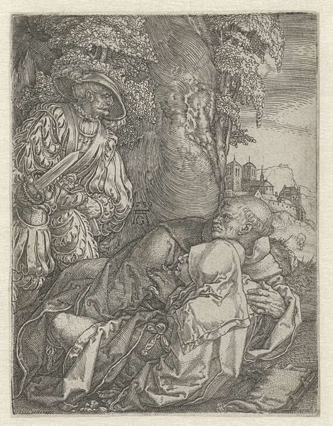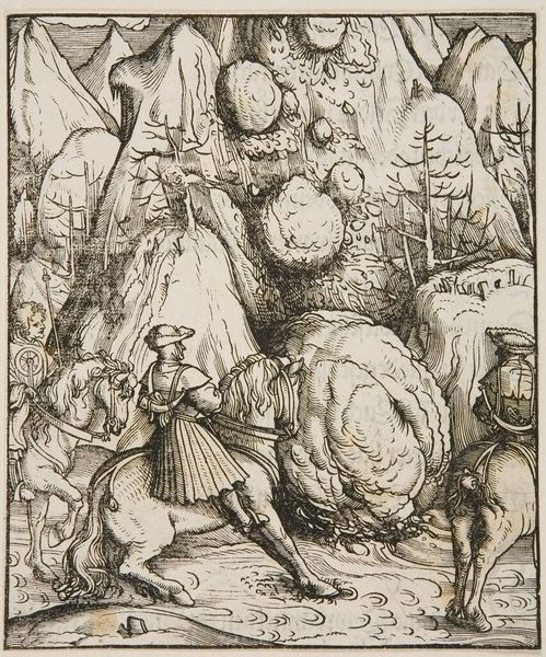 Curator: This is Albrecht Altdorfer's "The Agony in the Garden," currently in the Harvard Art Museums collection. Editor: I see figures tangled in a claustrophobic woodcut—the sky’s dark churn a sort of spiritual weather report. Curator: Altdorfer, working in the early 16th century, infuses the traditional religious scene with an almost unsettling intimacy through his use of tight compositions. Editor: You feel the weight of dread, don't you? The disciples slumped over while Christ seems utterly alone with that hovering angel. Curator: The print served a devotional purpose but also reflects the anxieties of the Reformation, where individual faith was undergoing immense scrutiny. Editor: Right, but on a gut level, it’s about wrestling with the dark, the terror that isolates us. Curator: It's fascinating how historical upheaval and personal turmoil can resonate so strongly across centuries. Editor: Exactly, it's like a concentrated dose of human emotion, preserved in ink.