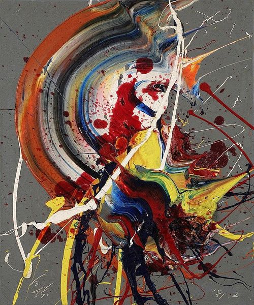 Curator: Standing before us is David Michael Hinnebusch's "Balloons," completed in 2003. This mixed-media piece is part of a private collection, blending figuration and abstraction with apparent influences from both graffiti and expressionist styles. My initial impression is somewhat chaotic, like a dreamscape turned inside out. What leaps out at you? Editor: The energy, definitely. It’s a raw, almost primal scream rendered in paint. Those dominant reds – a massive, almost toothy arch – evoke something powerful, perhaps even threatening. Yet, underneath, there’s a suggestion of tenderness. Are we looking at a fragmented self-portrait, perhaps? Curator: Potentially. Given Hinnebusch's artistic focus, the portrait element isn't a stretch. Look at the eyes peering through the abstract layers, or the faint outline of the human figure near the bottom, cradling a collection of small, colored circles. Do they remind you of pills, or perhaps some rosary beads? The symbolism feels intentionally ambiguous. Editor: Exactly. Ambiguity is its strength. The title, "Balloons," seems almost ironic considering the weightiness of the imagery. The can of "Balloons" is a curious focal point, acting almost as a totem. It could represent the fleeting nature of joy or perhaps the hollow promises of escapism. Even the graffiti-style tags add layers of meaning, speaking to ideas about self-expression. Curator: Absolutely, and there's something really arresting about the artist choosing a commercial motif when depicting what feels like very interior terrain. Do you agree that this "balloon" feels like a psychological device, maybe? Even the use of what seems like house paint gives the effect a rougher, working-class aesthetic. Editor: That rawness adds authenticity, a sense of immediacy. And psychologically, yes, it hits home. We're bombarded by cheerful images of balloons and carefree happiness, so the contrast here speaks to a universal tension. Think of balloons as visual cultural memes – a symbol everyone relates to differently according to their life story. This rendering challenges us to question those pre-packaged feelings. Curator: Well said. The way Hinnebusch fuses disparate elements, like recognizable objects, abstract brushstrokes, and those intense colors creates an emotional complexity that continues to resonate long after you look away. It asks the viewer to construct their own narrative and I love when a piece can create an instant conversation. Editor: A fragmented yet compelling dialogue, like the one within ourselves. Hinnebusch has given form to the cacophony, inviting us to join the fray.