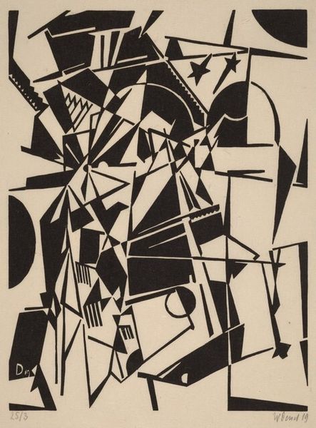 Curator: Right, let's talk about Sue Fuller's linocut print from 1944, entitled "Lancelot and Guinevere". It's a striking piece. Editor: It really is. The immediate impression is one of fractured drama. The stark red and black lines, the geometric shapes—they create a sense of chaos and conflict, despite the clear abstraction. Curator: The artist, Sue Fuller, made the work in 1944, using linocut to create the print. I think it's a mistake to divorce such abstractions from the historical climate, to see this, say, as solely relating to geometric forms; it was produced during World War Two, a time where identity was deeply fragmented. I'm always drawn to interpretations about how trauma and political change can impact art, and I wonder about those possible parallels here. What does the intersectionality of political turmoil mean? Editor: I appreciate that reading. For me, it’s as important to consider the social and artistic movements. We can understand its production in relation to the growing interest in abstract expressionism during and immediately after the war, for example, with European artists emigrating to New York. Curator: The angular, almost shattered, shapes really strike me. Could that angularity echo how these identities have shifted? What could a feminist reading contribute here? Were women involved with these love triangles? This work could address their role, whether to celebrate, reclaim, critique or question their roles as political or relational beings. What possibilities are made when artists focus on abstract subjects like Fuller does? Editor: Precisely! That dynamic interplay, Fuller’s choice of materials, places this print squarely within those discourses, the development of abstraction in a time when people needed art. We can also examine the narrative context she's drawing from and the social perception of Arthurian myths, the institutional value attached to courtly love, and see Fuller perhaps destabilizing such conventional tropes. Curator: A powerful subversion, wouldn’t you say? Viewing it through the multiple, intersectional lenses of the day. Editor: Absolutely. Each viewing deepens its impact, as art should.