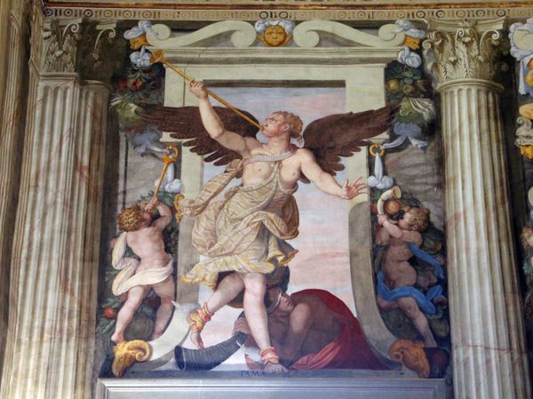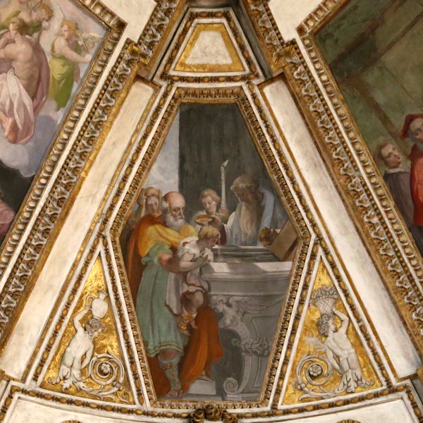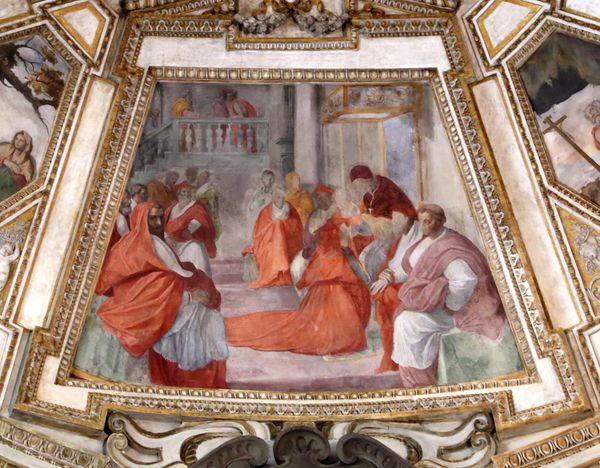 Editor: So this fresco is Alessandro Allori’s *Stories of St. Jerome*, painted in 1577, and it's located in Santa Maria Novella in Florence. I’m struck by how theatrical the scene feels, almost staged. How would you interpret Allori’s choices in this piece? Curator: A pertinent observation. The arrangement of figures does echo the Mannerist sensibility for artifice. Notice the meticulously rendered drapery; the folds cascading across the figures draw the eye into the composition, yet also serve to flatten the picture plane, denying the illusion of depth typical of the Renaissance. The limited color palette further contributes to a sense of heightened unreality. The focus on red, white, and muted earth tones creates a specific mood, wouldn’t you agree? Editor: Definitely. It's less vibrant than other frescoes I've seen. Is that flatness something that Allori emphasized deliberately, a kind of break from High Renaissance ideals? Curator: Precisely. Allori rejects the harmony and naturalism of the High Renaissance, opting for a more stylized and intellectual approach. Consider also the expressions of the figures; there is a deliberate lack of emotional intensity. What does this absence of feeling convey? Editor: Perhaps a focus on the intellect rather than the passion typically associated with religious narratives. Almost like an intellectual exercise rather than a moment of spiritual intensity. Curator: Yes, and consider that Allori may be making a conscious decision to favor the intricacies of surface design, over any deep narrative. By emphasizing formal elements like line, color, and composition, he calls attention to the artifice inherent in painting itself. How has this changed your initial impression? Editor: I now see how the composition works against a traditional, deeply emotional reading. The balance between realism and artifice is quite compelling, actually. It has a restrained intensity to it, like an exercise in controlled drama. Curator: Indeed, it's a study in controlled tensions and visual structure. These qualities elevate the artwork, not necessarily to the realm of the sacred, but rather the intellectual. A shift away from the purely devotional and towards the aesthetic appreciation of art.