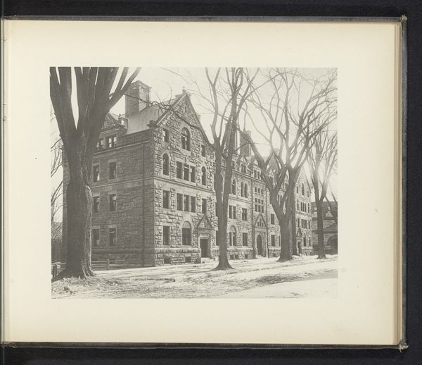 Editor: We’re looking at an evocative photograph from around 1895, titled "Exterieur van Lawrence Hall en Farnam Hall van Yale University te New Haven." It’s a gelatin silver print. There's this almost haunting stillness to the scene, a cityscape rendered in shades of grey, all those bare trees reaching skyward... What pulls you into this image? Curator: Haunting is a great word. To me, this photograph whispers of bygone eras, a pre-digital world suspended in time. What strikes me is the deliberate composition, the way the photographer uses those stark, skeletal trees to frame the architecture, to almost merge the man-made and the natural. There's a real Pictorialist influence at play here, wouldn’t you agree? The softness, the way it feels like a painting. Makes you wonder what Yale was like then. What kinds of stories were brewing within those brick walls? I like to imagine it was as rich and verdant in thought as it looked cold on a Winter’s day. Does the building’s geometry speak to you? Editor: I think the geometry of the building evokes such order in juxtaposition with the perceived randomness of the tree branches. So it looks painterly, you say? Is this style unusual for architecture? Curator: Unusual maybe isn't quite right, but the choice to almost soften the image, that definitely nudges it towards artistic interpretation, far away from a straightforward architectural documentation. The photographer isn't just recording a building; they're creating a mood, almost breathing a soul into those stones, inviting us into their perspective, don't you think? Like it is still whispering. Editor: I do. The more you speak the more this still gelatin print reveals! Now it does invite me to wonder and wander as if it were the most important mystery that needed solving. Thanks for sharing your point of view. Curator: And thank you. Art is no good without sharing the points of view!