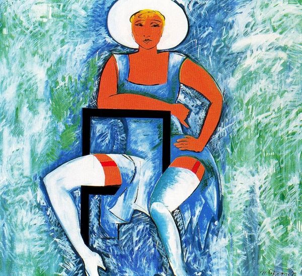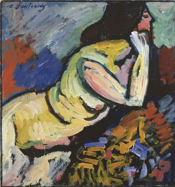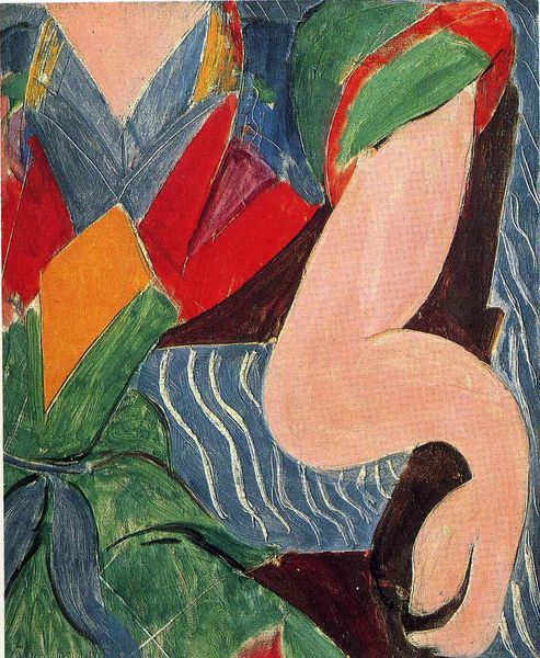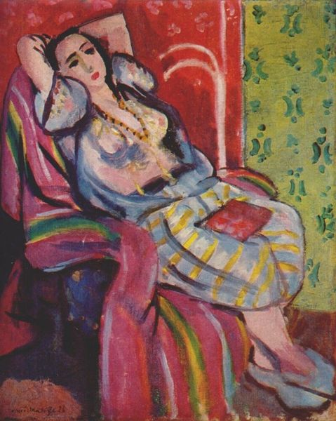 Editor: This is "Dancer in Repose" by Henri Matisse, painted in 1942. It's an oil painting featuring a reclining nude figure in a yellow armchair. The bright colours and somewhat distorted form create a really interesting tension, what do you see when you look at this piece? Curator: What strikes me is the context in which it was created. 1942… France was occupied by Nazi Germany. For Matisse, an artist known for his joie de vivre, to continue painting, especially a nude, was a defiant act. This isn’t simply a dancer at rest, but perhaps a symbolic resistance. Consider how the checkered background, bold colors, and distorted figure actively disrupt traditional notions of beauty and order. Editor: So, you're saying that the apparent ease of the scene might be deceptive, masking a deeper meaning connected to the war? Curator: Exactly! Art is rarely created in a vacuum. During the war, maintaining artistic practice and portraying figures with such bold lines and colour becomes a statement. It's also interesting to think about the "dancer" as a subject, which is also commonly objectified. But here, she takes up space and refuses to conform to social conventions. Is Matisse subverting that trope? Editor: I never thought about it that way, how he was consciously playing with established visual languages to deliver something meaningful amidst all that was going on. It definitely shifts my perception. Curator: And that tension is what makes it so powerful, isn't it? Considering what the figure represents against the cultural landscape of WWII France enriches it. It also teaches us that the choice of continuing his craft might be considered political because art-making offers agency for expression and subversion. Editor: That’s amazing. I am walking away looking at so many new layers. Thanks for that fresh approach! Curator: Anytime! Let's never take what seems to be self-evident at face value. There are hidden politics in anything aesthetic.