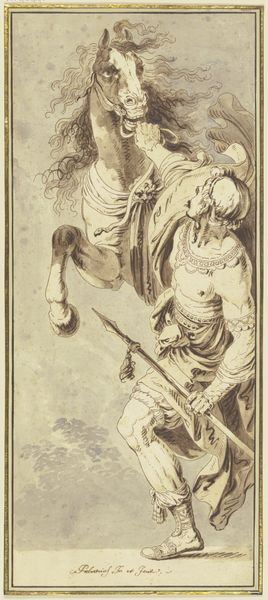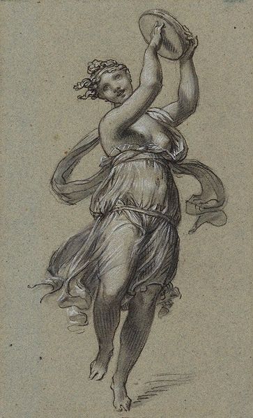 Curator: Immediately, I sense a dichotomy. This figure hovers between grace and severity. Editor: I agree, it's intriguing! What we are viewing is a drawing, dating to about 1756, by Stefano Pozzi. It’s called “Angel Holding Flowers and Scourge.” The medium is chalk and pencil on paper. Pozzi worked during the late Baroque and early Rococo periods. Curator: Flowers in one hand, a whip-like scourge in the other. What do you make of the juxtaposition? It seems purposefully contradictory. Is it peace or punishment she offers? Editor: That’s precisely what captures my attention. In this historical and social context, angels often serve as symbols of divine intervention and power, frequently used to reinforce established hierarchies. But there's an unsettling tension here. She is both gentle and forceful. Does she represent liberation or oppression? Who does this vision of an angel serve? Curator: I interpret the flowers as symbolic of redemption and the potential for renewal, offsetting the scourge’s implications of justice or penance. Throughout art history, flowers serve as transient metaphors, standing for fragile earthly beauty and innocence. Editor: I see your point, but let's consider what the "innocence" signifies, within this patriarchal religious framework. What does it require of us? Doesn’t salvation come at a price? I’m led to ask who gets to define what's innocent. Is the scourge an attempt to erase histories of oppression? Curator: Your emphasis on gender is apt; there's a vulnerability to her depiction despite her commanding pose. Note the delicacy of line used to depict her features; the paper's blue tint is itself symbolic of calm and peace, no? Perhaps she represents not worldly power, but inner strength and fortitude. Editor: Yes, the softness counters the harshness, offering room to rethink historical narratives about institutional authority. Instead of valorizing one interpretation, I believe this image pushes us to reconsider whose stories matter when talking about historical dominance. Curator: I concede; its complexity stems from not adhering neatly to any single symbolic reading. Pozzi coaxes us to consider the constant flux between seemingly contradictory elements. Editor: Ultimately, this drawing asks crucial questions about justice, absolution, and authority which resound profoundly in the world today. It reframes art history itself.