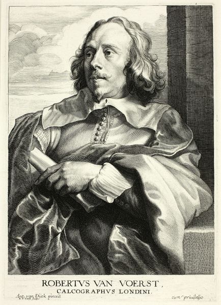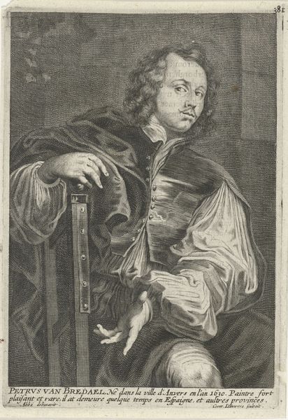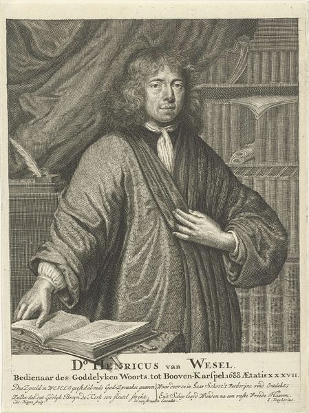 Curator: Standing before us is a rather compelling portrait, etched in the late 17th or early 18th century—sometime between 1664 and 1721, to be precise. It depicts Petrus van Staveren, an Amsterdam and Leiden pastor. The artwork is held here at the Rijksmuseum. Editor: It's immediately striking. The textures created through the engraving—particularly in the drape behind him and the subtle rendering of his robe—create an impressive visual richness. And that direct gaze... quite assertive. Curator: Indeed. This work fits squarely within the Baroque portrait tradition. What interests me, though, is its context. Printmaking had a vital role during this period in disseminating images, effectively building reputations and consolidating power within religious circles. This portrait likely served a similar purpose, reinforcing van Staveren's authority within his community. Editor: You know, focusing on the "how" here reveals another dimension. Think about the skill required to translate a likeness—likely from an earlier painting perhaps?—into the very precise lines of an engraving. The tools, the paper, the deliberate crafting... This wasn't mere replication; it was a meticulous act of material conversion, meant for wide circulation. The lines composing his garments speak of the textile trade itself—laborious efforts made accessible through skilled execution. Curator: And note how the text inscribed below the image names his civic and religious roles: this engraving publicly acknowledges his professional standing, underscoring a hierarchy maintained not just through piety, but tangible, publicly circulated imagery. The act of display becomes a form of institutional endorsement. Editor: The book he's holding—probably a bible—is also interesting. Its physicality, how his hand firmly rests on it, is telling. It's not just a symbol; it’s a physical object that underpins his social function and connects him to a lineage of material study and careful, physical engagement. Curator: It brings us to appreciate this artwork on multiple levels – not only as a representation, but as a vehicle within societal and religious systems of the period. Editor: A testament to how material culture shaped and perpetuated ideological and social order of its day. It’s remarkable, isn’t it, how the seemingly simple act of printing a portrait opens up these complex threads of understanding?