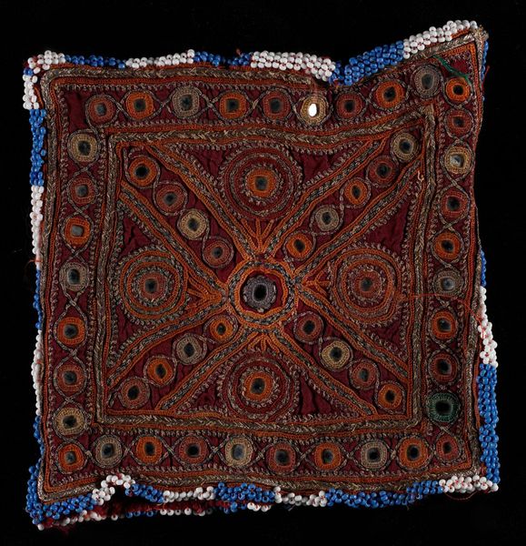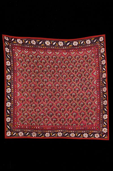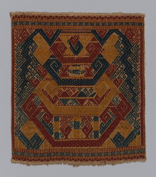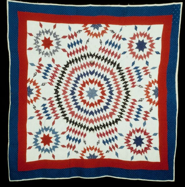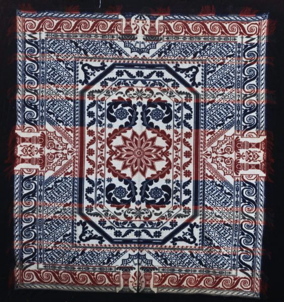 Curator: Here we have a “Shawl,” crafted in the 19th century, origin unknown. It resides here at the Minneapolis Institute of Art. Editor: My first thought? Dizzying. Absolutely visually dizzying, in a way that's also completely hypnotic. Curator: I agree, and let's start to unravel why. This textile presents us with a riot of geometric designs that are firmly entrenched in a specific style. Editor: Right, you can see what they're doing with the colors; warm against cool creating real vibrancy but within a pretty formal structure and the eye definitely returns to the center of the artwork. Curator: Yes. There's an undeniable current of Orientalism flowing through this work. The overall aesthetic, the patterns used. It transports the viewer. It is so richly decorated, you can see how important this would be to the owner. Editor: So interesting you said transport…I wonder if shawls like these, made their owners feel secure, loved, remembered perhaps…I love thinking that items like this absorb meaning. And become totems in themselves. Curator: Indeed. Looking closely, we can also observe how meticulously the textile has been crafted. You might feel the border creates a sense of containment, but in some ways the whole object can also be interpreted as expanding beyond itself—with its radiating composition. Editor: It's the kind of work that makes me think of a faraway land...a sensory experience beyond seeing. The maker has definitely shared part of themself when creating this textile. Curator: Indeed. And I suspect there are countless stories, whispered in time, embedded within its folds and threads.