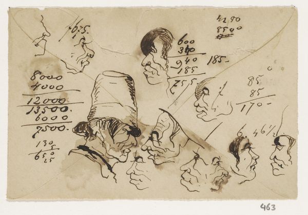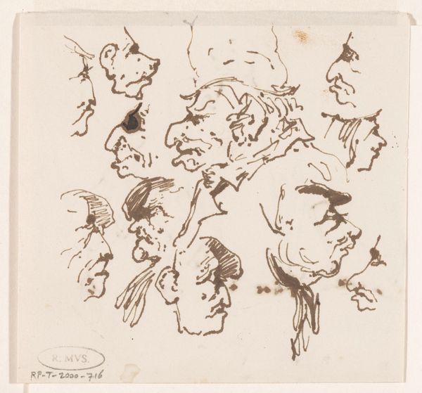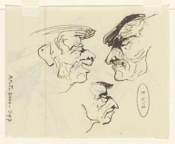 Editor: So, here we have "Vier Koppen," or "Four Heads," an ink drawing from somewhere between 1840 and 1880 by Johannes Tavenraat, residing here at the Rijksmuseum. They’re quick sketches, caricatures almost, but with a serious undertone. What do you make of their visual language? Curator: These heads, quickly rendered as they are, remind me that even the most fleeting image carries a weight. Note the pronounced features – the noses, the jutting chins. These are not simply physiognomic studies. Tavenraat captures something deeper, a personality hinted at through exaggerated form. Consider how caricature, throughout history, has been used to mock, but also to remember. Editor: Remember? I usually think of caricature as purely for ridicule. Curator: Indeed, it can be, but think of these exaggerated features as shorthand, almost hieroglyphs, for certain character traits or social positions. What attributes do you think the artist may be calling out through the different line treatments in each of the heads? Editor: The large central figure, with the biggest nose, seems…pompous? The finer lines of the smaller heads seem to suggest delicacy or timidity, perhaps? Curator: Precisely. It's fascinating how effectively, with just a few strokes, Tavenraat can evoke complex emotional and social realities that would be familiar to his contemporary audience and carry into cultural memory, even today. Think of similar characters in later traditions of theater or cartoons - does the symbolic language connect? Editor: Absolutely. I’d never considered how much cultural coding goes into even the quickest sketch. I’ll definitely look at caricature differently from now on! Curator: That intersection of immediacy and layered meaning… it's what keeps these "simple" sketches resonating across time.