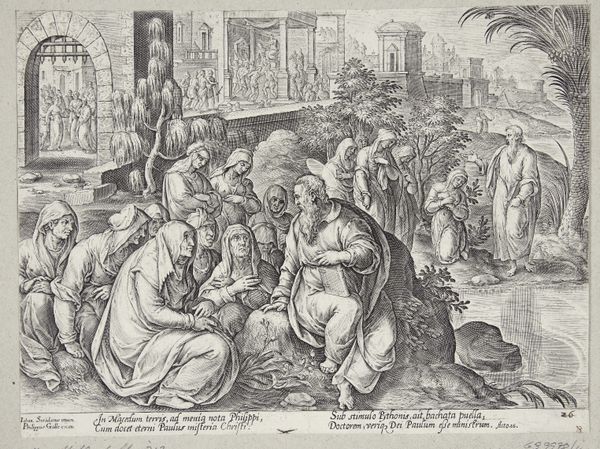 Pieter van der Heyden’s ‘Kruisiging’ engraving presents a scene dominated by stark contrasts of light and shadow, heightening the emotional intensity. The figures are meticulously rendered, their poses and expressions conveying deep sorrow. The composition is structured around the three crosses, which create a strong vertical axis. The arrangement of the figures below forms a semi-circle, drawing the viewer's eye towards the center of the drama. Van der Heyden employs a dense network of lines to model forms and create texture, a technique characteristic of engraving. The architectural backdrop, rendered with precise detail, provides a stark contrast to the raw emotion of the foreground figures. The inscription at the bottom grounds the image in the theological doctrine that Christ was wounded for our transgressions, framing the crucifixion as a moment of sacrifice. The artist utilizes a complex interplay of form and content, inviting us to reflect on themes of suffering, redemption, and the human condition.