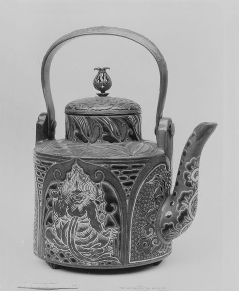 This stoneware tankard was crafted by Eigelstein, a German artist active in the 16th century. At first glance, one notes the interplay of horizontal striations at the top and bottom, contrasting with the intricate figural relief in the middle, all rendered in a muted grey tone. This contrast creates a tension between rigid structure and dynamic storytelling. The body of the tankard is decorated with what appears to be a courtly scene. The figures are framed by dense foliage. The artist’s attention to detail is evident in the textures and patterns, which serve to animate the narrative and invite closer inspection. The interplay of form and function in this piece reflects a broader cultural concern with ornamentation and utility during the Renaissance. The tankard is not just a vessel, but also a canvas for conveying social and cultural messages. It represents the convergence of art, craft, and daily life in the 16th century.