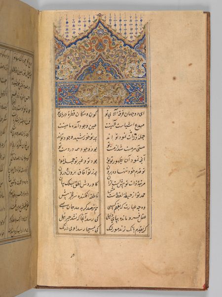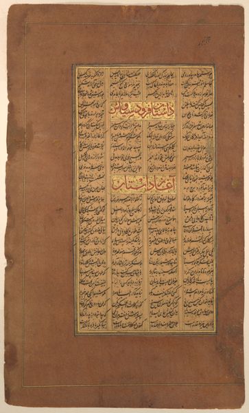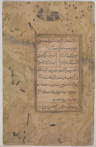 Editor: Here we have Folio 172 from the Divan of Anvari, attributed to Mahesh. It's a rather petite manuscript page. The calligraphy is so intricate; it almost feels like a woven tapestry. How do you interpret this work? Curator: It’s an enchanting piece, isn't it? I see a bridge between the earthly and the divine. The text, likely poetry, is framed by a delicate border, suggesting a glimpse into a world beyond our own. I wonder, what emotions does the calligraphy evoke in you? Editor: I feel a sense of serenity and timelessness. Curator: Yes, a testament to the enduring power of words and art, wouldn’t you agree? It reminds us that beauty can be found even in the smallest of spaces. Editor: Definitely, I appreciate how this piece blends visual art with the written word, creating a harmonious whole.
