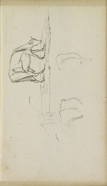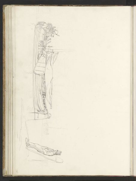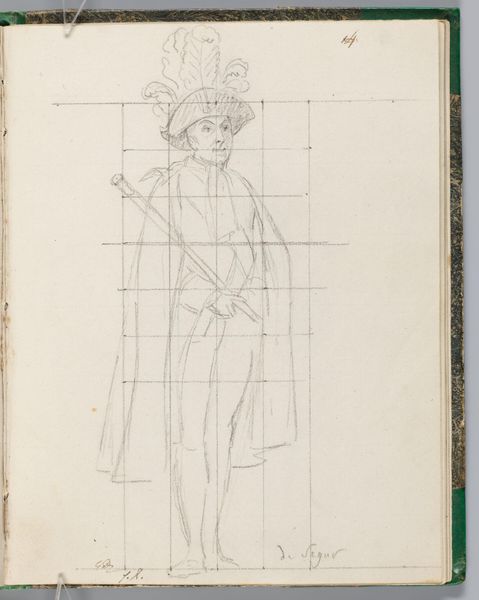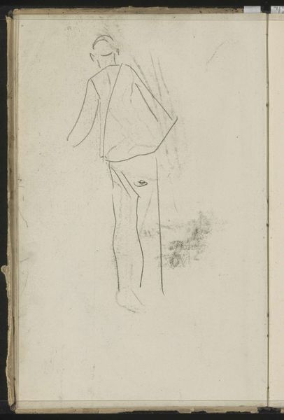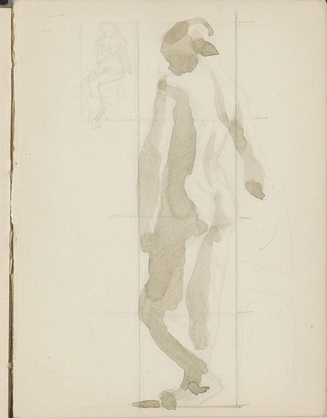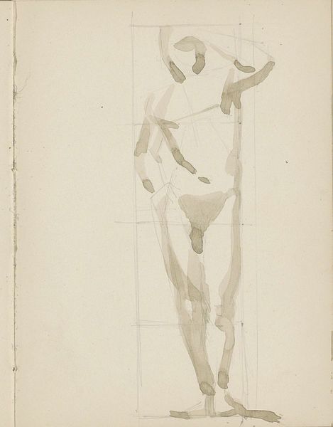 Curator: Here we have "Standing Nude Woman with One Arm Raised", a pencil drawing by Reijer Stolk, dated sometime between 1906 and 1945. It's part of the Rijksmuseum collection. What's your first take? Editor: Ghostly. Ethereal, even. It's barely there, this figure. Just the faintest whisper of a human form on what looks like toned paper, like she's about to fade back into the void from whence she came. Curator: Interesting. The "barely there" quality speaks to its function as a sketch. We see the underlying grid, the artist's framework. This isn't about polished presentation; it's about the labor of observation and construction. Stolk is working through the challenges of depicting the human form. Editor: Absolutely. It feels deeply personal, like stumbling across a page in the artist's private sketchbook. A quick study, perhaps, before tackling a more formal work. It’s got a raw, almost vulnerable quality because of that. Did many academic artists use nude sketches as studies? Curator: Absolutely. Nude studies were fundamental to academic art training. It honed the artist's understanding of anatomy, light, and form. But the economic realities also factored in. Drawings like this were often produced as teaching aids for other artists to learn figure construction without commissioning costly paintings or sculptures. Editor: So it's both a learning tool for the artist and potentially a resource for others. I like that connection. It reframes the artwork less as a piece of aesthetic brilliance but one small link in a whole chain of artistic knowledge sharing. Curator: Precisely! It decenters the individual genius and puts the emphasis on the communal nature of artmaking and transmission. What's also remarkable is the light pencil work. The economy of lines conveys the essence of the figure. It’s more about suggestion than rigid definition. Editor: The unfinished nature is also compelling. The figure is cropped, seemingly arbitrarily. Are we, as viewers, implicated in this artistic exercise, meant to imagine what extends beyond the frame? It really draws you in. Curator: It definitely provokes contemplation. Looking at this through a material lens reminds us that even a simple drawing involves labor, resources, and a network of exchange. Editor: Yes. I come away feeling a sense of quiet intimacy with Stolk, observing his practice through time. Almost a little peek behind the curtain into an artist’s everyday struggle, their dedication.