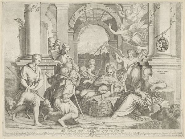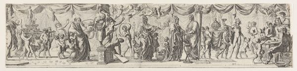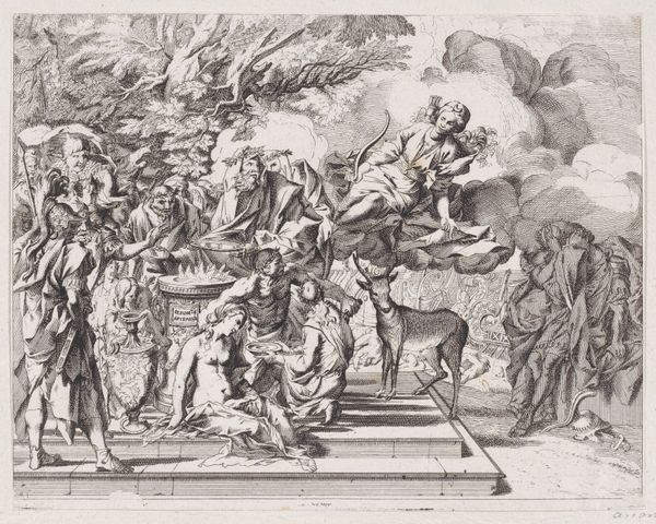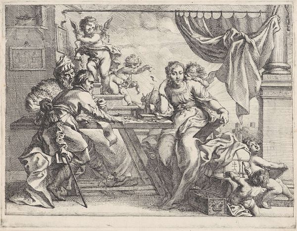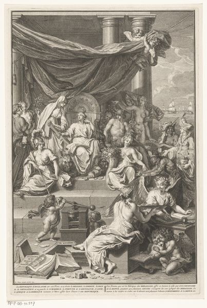 Curator: The work before us is titled "Allegorisch vignet met het wapen van een kardinaal," or "Allegorical vignette with the coat of arms of a cardinal." It's an engraving by Pieter Tanjé, likely created between 1716 and 1761, and it's part of the Rijksmuseum's collection. Editor: My first thought? Drama. It's all billowing robes and distressed expressions. The sheer number of figures packed in makes it feel so full, almost overflowing with significance. And what's up with the rooster? Curator: Exactly. That density is very deliberate. This vignette utilizes the visual language of baroque allegory, meant to impress and convey multiple layers of meaning simultaneously. Coats of arms in the 18th century were important visual signifiers not only of power but of allegiance. These images helped define how both powerful religious figures wanted to be perceived and how they wanted to exert soft power within the communities they led. Editor: So it's not just showing off their bling, it's sending a message. The figures really sell that sense of... self-importance. Everything about it feels so staged, like a theatrical production of faith and authority. Even the way those putti cluster around; the scene almost feels suffocating to my modern eyes. Curator: Absolutely. The work draws heavily from academic art traditions emphasizing formal technique and symbolism. Consider the figures themselves – the cardinal's coat of arms sits elevated while virtues such as Charity, Truth, or Wisdom stand beside, and a vanquished sin, represented by that bent, haggard man in the foreground, wallows in the shadows at the bottom. It reinforces hierarchical structures, positioning the Church as a protector and dispenser of grace. Editor: So the guy by the rooster really sold it. If anything that imagery would have reminded me what needed changing, needed grace, in that time. It does work, in a strange way, and really brings together the message with its heavy emotion. I love how the rooster challenges him and it is really funny! Curator: Seeing this artwork lets us understand some of the specific visual strategies baroque artists adopted for promoting certain political figures. It’s fascinating how certain choices of art were used. Editor: I totally get that it shows off not only art, but propaganda of its own kind, especially in the religious arena! You've definitely opened my eyes to looking at that chicken!