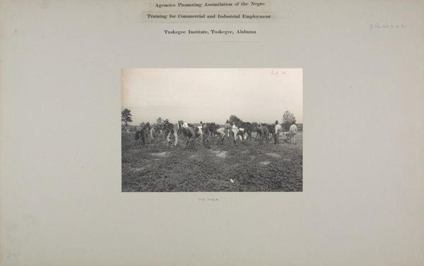 Editor: This photograph, taken by Frances Benjamin Johnston, is titled "Studying the Cow," and it seems to depict a scene at the Hampton Normal and Agricultural Institute. I’m struck by the composition - a group of students intently observing a cow. What historical narratives do you see at play here? Curator: It's crucial to consider the context. The Hampton Institute aimed to assimilate Black Americans through industrial and agricultural training. The photograph stages a vision of Black students learning practical skills. But this image participates in the problematic narrative of "uplift," suggesting that Black people needed to be taught basic skills to be considered equal, and it ignores existing knowledge systems. How do you interpret the power dynamics visualized in this scene? Editor: It is unsettling to consider the ways the photograph promoted harmful stereotypes of progress and assimilation. Curator: Exactly. It is a reminder of the complex and often contradictory role art plays in shaping social perceptions.