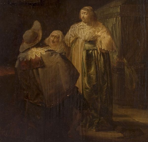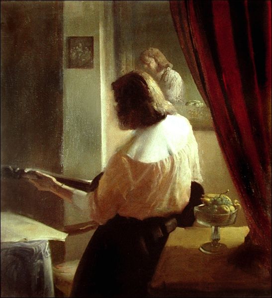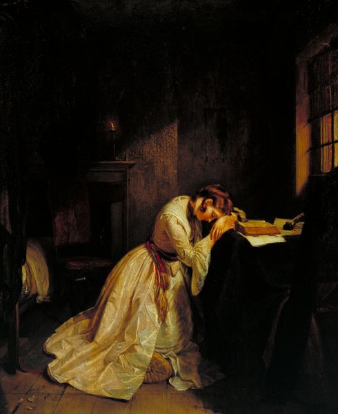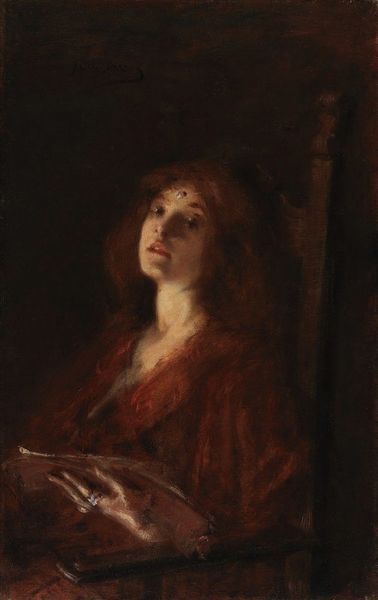 Editor: Here we have John Collier’s “All Hallowe’en” painted in 1895 using oil on canvas. I am really captivated by the mood – it feels so intimate and almost a little eerie with the candle light reflecting on her face in the mirror. How do you interpret this work, with its particular play of light and shadow? Curator: Observe the formal arrangement; the canvas is divided into distinct planes. The foreground displays a figure largely in shadow, guiding our sightline. The strategic use of chiaroscuro—that stark contrast between light and dark—not only shapes the forms but also contributes significantly to the emotional weight. Consider the geometric structure of the mirror; what impact does this "window" have on your perception? Editor: The mirror does create another dimension...like the woman is in dialogue with herself? The angles, lines, and balance between dark and light are all so deliberate, directing my eye. Curator: Precisely. The composition is structured to emphasize the woman's gaze. The subdued palette further contributes to a psychological reading, drawing attention to the emotional content manifest in her expression. Is the apple significant to your interpretation? Editor: Possibly as a reference to Eve or temptation in the context of self-knowledge, maybe? I focused so much on the emotional aspects that I hadn't quite teased that out yet. Curator: Indeed. Through meticulous rendering of light and form, Collier encourages an examination of interiority and perception. This formal reading unlocks a deeper symbolic understanding. Editor: This makes me rethink my initial interpretation. Now I appreciate how form creates the haunting effect beyond just the representation of the subject and I am now questioning myself, thinking of that apple! Curator: Exactly. Sometimes the most powerful elements lie not in overt narratives, but in the nuanced interplay of visual components.