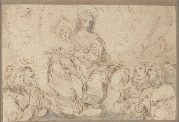 Hendrik Krock created this drawing of two seated female figures around a medallion featuring Herakles, or Samson, wrestling a lion, sometime between 1671 and 1738. During this time, Europe was experiencing shifts in power, religion, and philosophy, influencing art to explore themes of strength, virtue, and classical narratives. The drawing presents us with a central scene of a male hero in combat, flanked by two seated female figures, their expressions and gestures seemingly offering commentary on the heroic struggle. Considering this piece through a feminist lens, we might ask whether these women are merely allegorical figures meant to glorify male heroism, or do they possess agency within the narrative? How might their roles reflect the limited spaces women occupied in the social and cultural structures of Krock's time? The artist’s choice to depict this scene raises questions about societal values and the roles assigned to different genders. The drawing provides a window into the complex interplay between historical narratives, gender roles, and artistic expression.