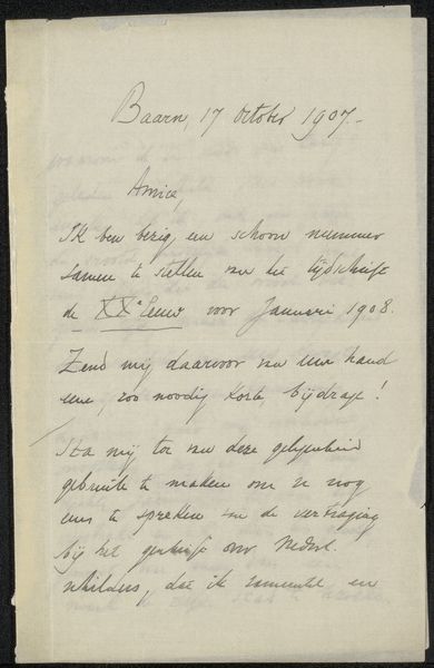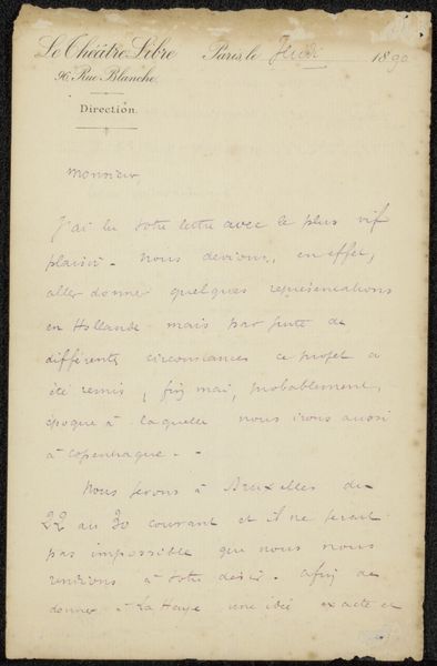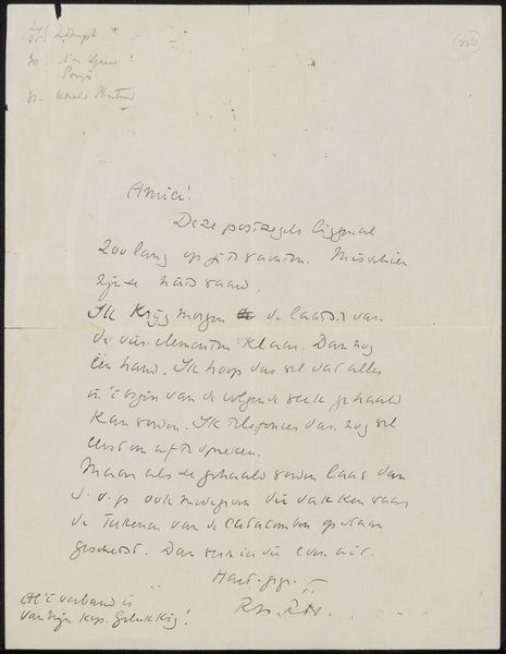 Curator: This captivating piece, entitled "Brief aan Philip Zilcken," dates roughly from 1890 to 1930. It's a drawing in ink on paper, currently housed at the Rijksmuseum and is associated with the Arti et Amicitiae artist collective. Editor: My initial reaction is this feels incredibly intimate. It's not grand, not trying to impress. It’s a humble letter, imbued with the writer’s quiet urgency, and perhaps some self-doubt? The handwriting itself feels so personal, you know? Curator: The beauty, as always, is in the subtext, the clues embedded in this everyday item. Note how the letterhead is still clearly visible, grounding this personal communication within the established world of "Arti et Amicitiae"—a known nexus for artistic exchange. It's a fascinating look at professional circles! Editor: Absolutely! It's like a backstage pass to the artist’s world, and in my interpretation, perhaps even to his concerns about finances or exposure of their artwork. Do you notice any underlying implications in the way they were writing? The details that might provide emotional clues? Curator: Yes, particularly in phrases referencing lithography and financial agreements. The artist emphasizes mediation and percentages in very carefully-chosen words; revealing a cultural tension and perhaps dependence of artists and art sales during this era. This shows that money, markets, and even networks played significant parts in those years. Editor: Money worries— the bane of every artist! There’s this poignant rawness to viewing this private correspondence in all of the careful script. As I read it, it makes the person somehow alive in that moment. I wonder how Philip Zilcken might have received it, or felt as he read along? Curator: Indeed. The emotional layering here runs deeper than the literal meaning. To contemplate what kind of responses those words must have had, in that era's artistic atmosphere gives more importance to a letter such as this one, revealing a specific network between artist collectives like Arti et Amicitiae and particular individual connections like Philip Zilcken's position to affect visibility for artists such as Van Gogh and those who supported or sold his works. Editor: Letters! Once so common, and now nearly obsolete... To see this, to read the thoughts, aspirations, probably even quiet anxieties written down... that simple document from an ink drawing contains all sorts of feelings across the decades. How awesome is that? Curator: Ultimately, this "Brief aan Philip Zilcken" functions almost like a time capsule, offering insight into artistic livelihoods, financial challenges, and the intricacies of professional relationships in the art world. A simple material holding profound depth.