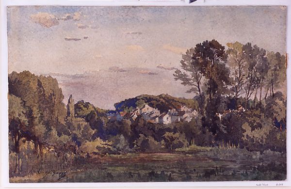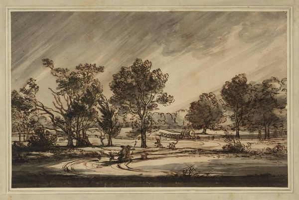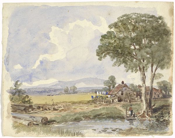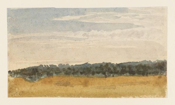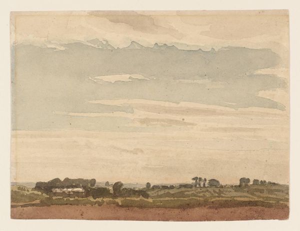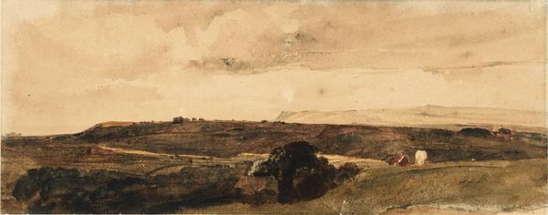 Editor: So this is Joshua Cristall's "Near Paddington Fields." It's a watercolor, and I'm struck by how muted and earthy the colors are. What can you tell me about this work? Curator: I see here a watercolor indicative of early 19th-century England's evolving relationship with land and labor. Consider the materials: the pigment's source, the paper's manufacture, the very accessibility of these tools speaks to Cristall's place within a system of production and consumption. Editor: That's interesting. So, you're saying the painting itself is a product of its time, not just a reflection of it? Curator: Precisely. The subtle tones, the implied labor in the fields, these aren't just aesthetic choices. They reflect the socioeconomic realities that shaped both Cristall's life and the landscape he depicts. What is the relationship between the artist and his materials? Editor: I never thought of it that way. It makes me consider the role of the artist in the broader economy. Curator: Indeed. It encourages us to look beyond the surface and consider the material conditions of artistic creation.