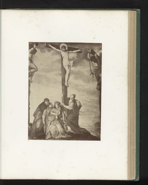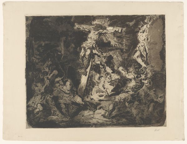 Jean Baptiste Pierre Michiels created this artwork, "Longinus Steekt de Gekruisigde Christus Met Een Lans," using etching, around the mid-19th century. The print is dominated by a tightly packed composition, featuring a multitude of figures gathered around the central image of Christ on the cross. Notice how the artist employs stark contrasts of light and shadow to heighten the drama, creating a sense of emotional intensity. Michiels uses the semiotic language inherent in religious art to create meaning. The lance, the cross, and the figures surrounding Christ are visual signs loaded with cultural and religious significance. These elements combine to destabilize any simple interpretation, prompting viewers to engage with themes of faith, suffering, and redemption. The etching technique lends a tactile quality to the scene, underscoring the themes of pain and sacrifice. This invites ongoing interpretation as we consider the interplay between artistic form and cultural meaning.