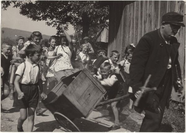 Helen Levitt made this photograph, titled 'New York', with a Leica camera, likely in the 1940s. Levitt, associated with the New York school of photographers, documented everyday life in working-class neighborhoods, capturing fleeting moments of urban life. Here, we see a group of children in what seems to be a poor neighborhood playing with a large frame. There’s a beautiful tension here between the children, who are fully immersed in their play, and the adults behind them, caught in their daily grind. The children’s improvised games comment on the lack of resources available to them, but also on the potential for creativity even in difficult circumstances. Levitt's work also reminds us of the public role of art. Her images draw attention to the everyday lives of ordinary people. To understand this photo fully, we could examine the social and economic history of New York during the mid-20th century. We could also look at the history of street photography and its relationship to social reform movements.