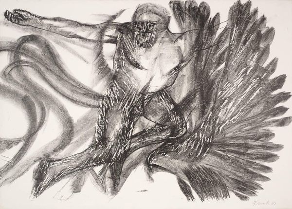 Maria Bozoky made "Babits: The Book of Jonah II" with ink on paper, and it's this furious dance of black marks on a white ground. You can really sense Bozoky working through something, the pressure of the brush, the urgency of the moment. The materiality here is all about the contrast between the slick, fluid ink and the absorbent paper. See how the ink bleeds and feathers in some areas, creating these soft, gray shadows, while elsewhere it sits on the surface in sharp, decisive lines? That big, round eye of the fish is so simply rendered, just an outline, but it holds the whole composition together. It's like everything else is swirling around it, caught in the same riptide. This piece reminds me a bit of Cy Twombly’s work, in the way it balances gesture and form, chaos and control. But where Twombly is all about the grand gesture, Bozoky feels more intimate, more personal. It's a reminder that art doesn't always have to be pretty or polished; sometimes, it's about wrestling with something difficult and finding a way to make it visible.