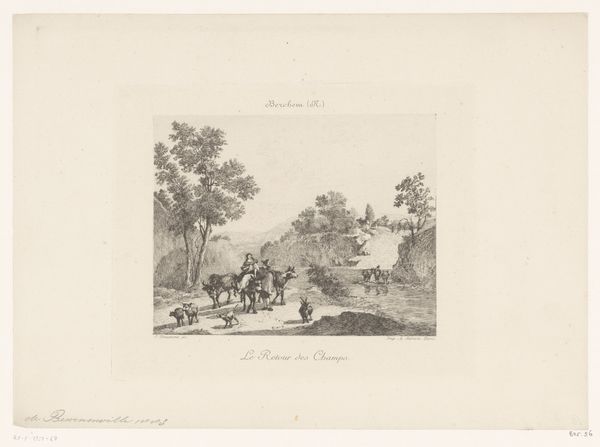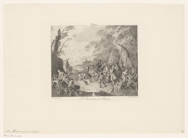 Editor: Here we have "Dancers around a Maypole", a print made by Gustave Mercier, sometime between 1868 and 1898. It's an engraving that depicts a lively scene with people dancing and gathering around a maypole in a rural setting. It feels quite joyful and organized in its composition. What strikes you when you look at it? Curator: The piece operates within a clear structural framework. Consider the tonal arrangement; Mercier employs delicate hatching techniques to differentiate textures and to sculpt the spatial relationships between the figures and the landscape. The composition emphasizes the interplay of light and shadow, constructing a visual rhythm that guides the viewer’s eye from the foreground figures to the more softly defined architecture in the background. Do you notice how the verticality of the maypole contrasts with the horizontal sweep of the landscape? Editor: I do see how the maypole shoots upward. Is there anything more to it, beyond being just a festive village scene? Curator: The piece employs signs which create deeper meanings. The Maypole, positioned centrally, acts as a key signifier of community and ritual. The arrangement of figures also conveys a sense of structured social interaction, and observe how Mercier creates a cohesive narrative using precise compositional methods, organizing individuals into a communal scene. Consider, how would your experience of this scene change were the maypole positioned to the periphery of the composition? Editor: It is amazing how all of the figures direct the viewers attention towards the pole. Now that you mention all of the signs involved, I understand how they support a cohesive narrative! I appreciate the close visual reading. Curator: Indeed. Such formal examination enables us to recognize how even a seemingly straightforward genre painting operates as a structured and thoughtfully constructed visual argument.