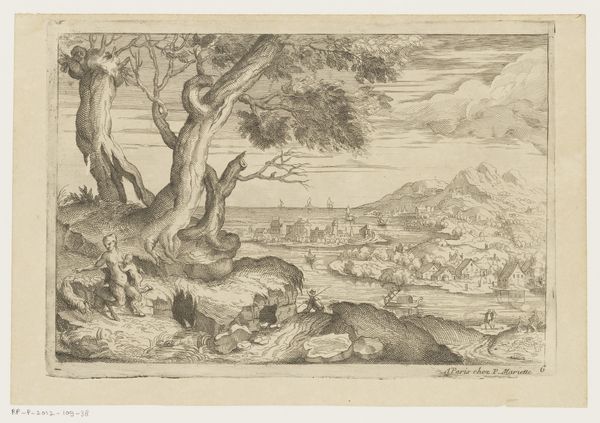 Jean Pesne created this landscape with bathing figures using etching techniques in the 17th century. This was a period marked by significant social and political stratification. The landscape, a stage for human activities, reflects these societal dynamics. Look closely and you'll notice the figures within the scene are engaging in different activities, reflecting the social hierarchies of the time. Some are leisurely bathing in the water, while others stand clothed on the periphery. How does Pesne portray the body in relation to its social context, and how do these depictions reinforce or challenge existing norms? Consider the gaze—who is looking at whom, and what power dynamics are at play? In essence, Pesne’s landscape operates as both a visual pleasure and a complex social tableau. It allows us to consider how deeply ingrained societal norms shape our perceptions.