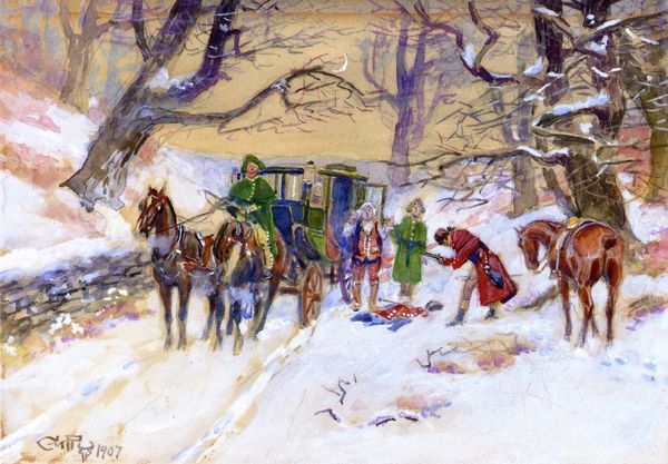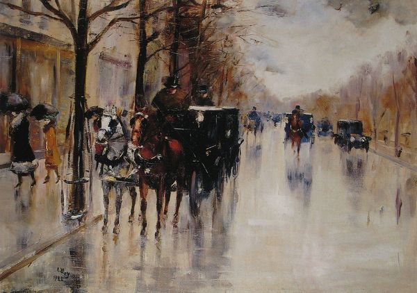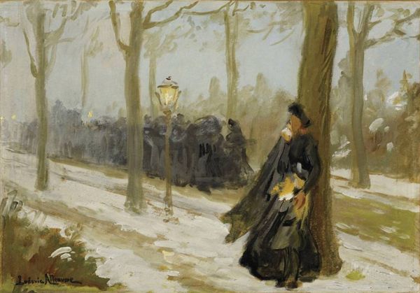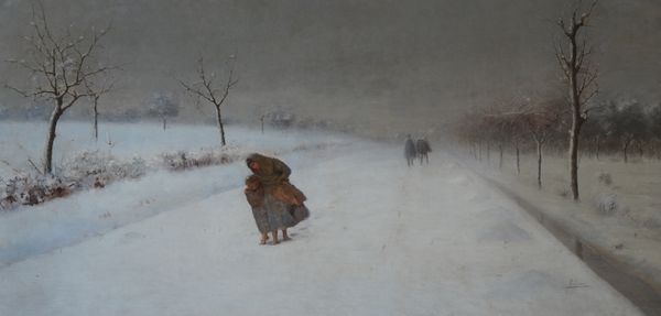 Curator: Let's take a moment with Childe Hassam's "Street Scene with Hansom Cab," painted in 1887. What strikes you first about this particular slice of snowy urban life? Editor: The sheer density of atmosphere. That haze of snow softening every edge, creating an almost monochromatic palette. The formal composition leads the eye to the focal point of the driver sitting atop the Hansom Cab. Curator: It's fascinating how Hassam captures the upper-class experience juxtaposed with the ordinary citizens navigating a winter day. The hansom cab itself becomes a symbol of wealth and privilege navigating a public space. How do you think he uses color to emphasize social dynamics in the street? Editor: Color seems almost deliberately muted; perhaps to create a dream-like almost ethereal perspective? The dark cab in opposition with the white street makes it visually compelling but what the narrative being told? Is the light the artist using, is he signaling new or old money? Curator: Perhaps Hassam hints at the social stratification inherent in urban life through the blurred figures on foot. The obscured identities speak volumes, don't you think? Editor: Most definitely! The technique is clearly impressionistic; but it moves into this intersectionality where we have people’s perception blurring to indicate socioeconomic conditions during the late 19th century. You might call it pre-postmodern even. Curator: Thinking of this intersectionality within a broader social and feminist framework, it shows how women and marginalized communities move, navigate and intersect with places like the streets we are visualizing, sometimes fading to become obscure and at other times more central. Editor: Exactly. This is a very interesting visual, blurring and sharpening the lenses when understanding a historic art movement. Curator: Well, looking at the class dynamic here from today's point of view is an eye opener. Editor: It certainly has changed how I see it. A successful interpretation all around, I'd say.