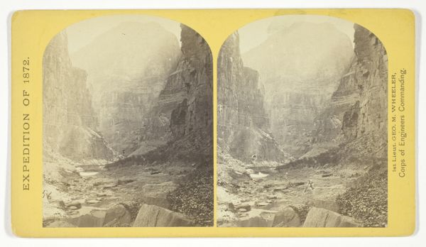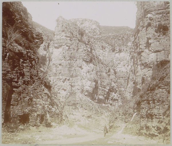 Editor: Here we have William Henry Jackson's "Kloof met een spoorlijn langs de Grand River in Michigan", a photograph from around 1860 to 1900. I find the muted tones create an almost ghostly feeling, and I’m curious about what’s going on with that railway track carved into the landscape. What do you see in this piece? Curator: This image really speaks to the transformative power of industrialization. I'm interested in the very materials used – the photographic emulsion, the paper, the way Jackson harnesses light and shadow. He's not just representing the landscape; he's documenting the profound changes humans are inflicting upon it through material means like the railroad. Think of the labor involved in constructing those tracks, the raw materials extracted, the communities impacted. What's your perspective on the relationship between nature and industry here? Editor: Well, the image does highlight a pretty stark contrast. You have these grand, almost timeless geological formations and then this very deliberate, human-made structure cutting through it. It makes you wonder about the long-term effects of this kind of intervention. Is it sustainable? Curator: Exactly. The photograph, as a physical object, embodies that tension. Jackson’s choice to include the railway forces us to consider the resources, both human and natural, necessary to produce this progress. Even the act of capturing this image is a material process that is embedded in the development of the West. This landscape is no longer sublime, but becomes a commodity itself through extraction. Editor: I never really considered that, seeing the image as part of the process rather than just a record of the landscape. Curator: It is a record, of course, but it's one produced through material processes inherently linked to what it depicts: development, industrial expansion and their associated resource exploitation. It makes you consider photography as an instrument for documenting this transformation. Editor: That’s a perspective shift for me, thanks! I’m starting to think more about how even art plays a role in that material and social context.