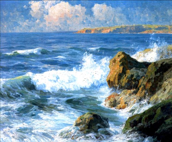 Maurice Braun made this painting of a seascape with oils and canvas at an unknown time and location, though I can see he was probably right there, on the shore. Braun’s approach to paint application in this piece is quite soft; he blends and blurs the edges of the forms to create a hazy, atmospheric effect. You can see this especially in the sky, where the pinks and blues of the clouds seem to melt into one another. Looking at the rocks in the foreground, I notice how he uses the impasto technique to build up a thick, textured surface. The strokes are visible, like he’s carving the forms out of the paint itself. It reminds me a little of Monet, though Braun’s colors are more muted, with a slightly melancholic feel. The overall effect is one of quiet contemplation, as if Braun were trying to capture not just the look of the sea, but also its mood. It feels like a love letter to the ocean.