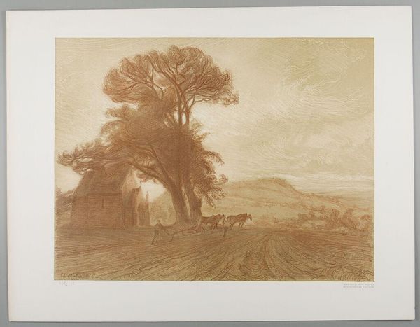 Curator: Here we see Charles-Marie Dulac's drawing, "Jesu Via et Vita Nostra / Jesu Thesaurus Fidelium," housed here at the Harvard Art Museums. Editor: It strikes me as a somber scene; the muted tones create a very contemplative mood. The barren tree dominates the landscape. Curator: Dulac, a late 19th-century artist, was deeply religious and his work often reflected his faith. The title itself, translating to "Jesus is our way and our life/Jesus, treasure of the faithful," suggests the drawing is meant to be devotional. Editor: Absolutely, and one can interpret the figures in the fields as part of the endless cycle of labor and faith during the period. It seems they're toiling the fields under the watchful eye of an almost skeletal tree. What does that communicate? Curator: Perhaps a visual reminder of the connection between earthly toil and spiritual reward, a common theme within Christian iconography and social structures of the time. Editor: I agree, and considering the limited visibility and light, I can see how Dulac's work resonates with broader narratives of hardship and hope within religious experience. Curator: Thank you for sharing your thoughts. It is always beneficial to reconsider art and history with different points of view. Editor: Indeed. This exercise is a great reminder that art offers endless opportunities for insight and reflection.
