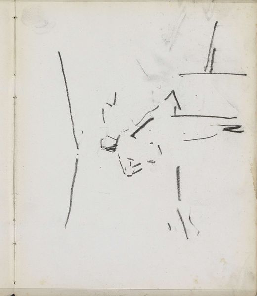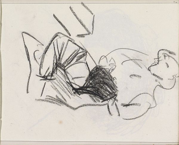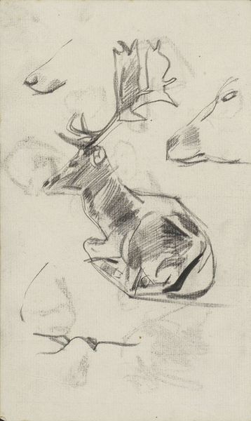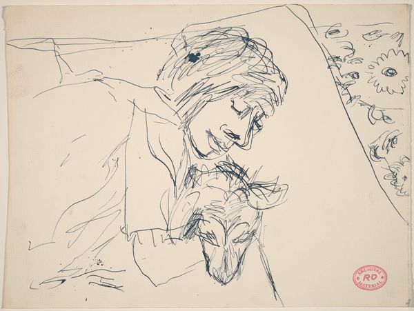 Curator: The rapid, gestural lines give this sketch a dynamic energy, almost vibrating on the page. Editor: We are looking at an untitled work on paper by Charles Martin. The piece resides in the Tate Collections and offers an intriguing glimpse into Martin's process. Curator: The materiality of the ink, a dark brown, creates a stark contrast with the off-white paper, further enhancing the sense of immediacy. The density of the lines in the head gives the object a sense of weightiness. Editor: Considering Martin's career, it's likely this sketch served as preparatory work, possibly for a larger, more formal composition. Think of the societal pressures of the 19th century pushing for realism. Curator: The interplay between positive and negative space is also quite compelling. The absence of line is just as important. Editor: Indeed. It makes you wonder about the context in which Martin made this image, perhaps a study from life or memory. Curator: The structural economy achieved through line alone is quite fascinating. Editor: Thinking about its display today, it encourages us to consider not just the finished product, but also the artist's journey. Curator: I agree. There is an undeniable sense of vitality. Editor: A valuable addition for understanding 19th-century artistic practices.